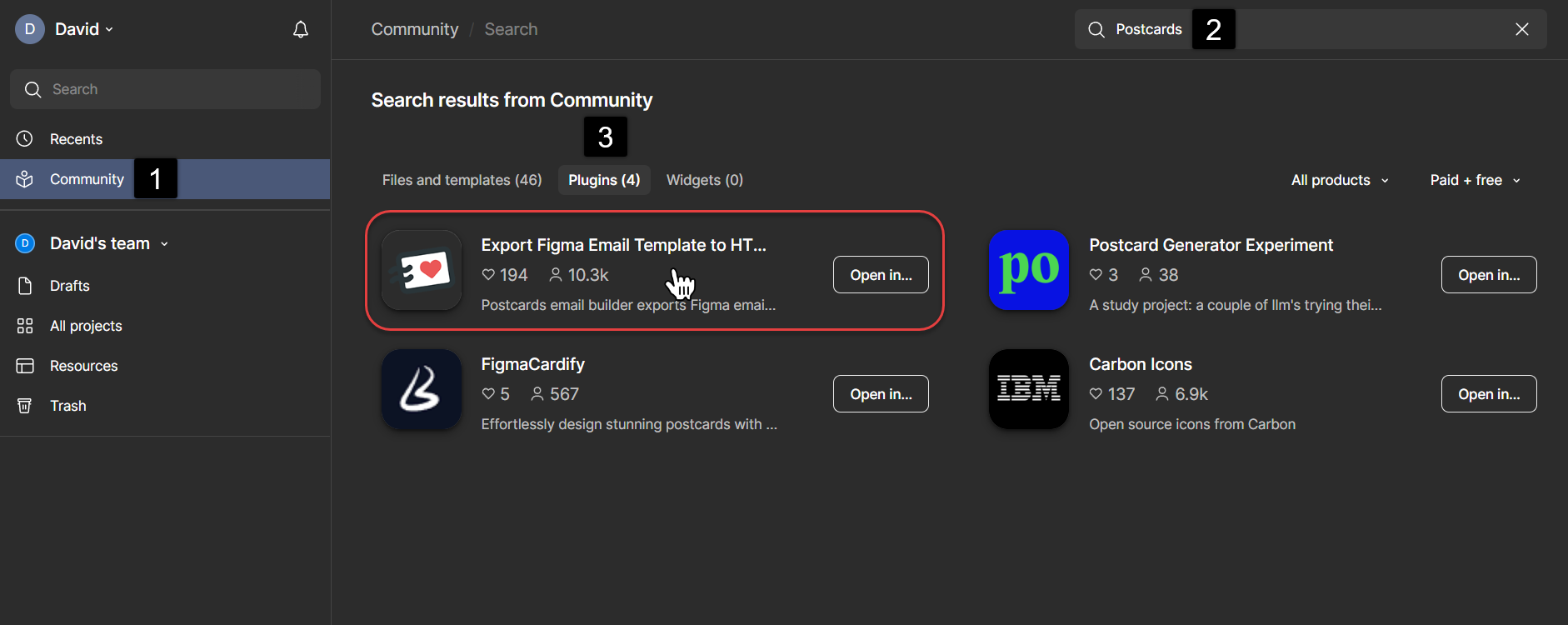 - In the top-right search bar, type “Postcards” then click the Plugins filter button to narrow your results, and select Export Figma Email Template to HTML – Postcards Email Builder from the list.