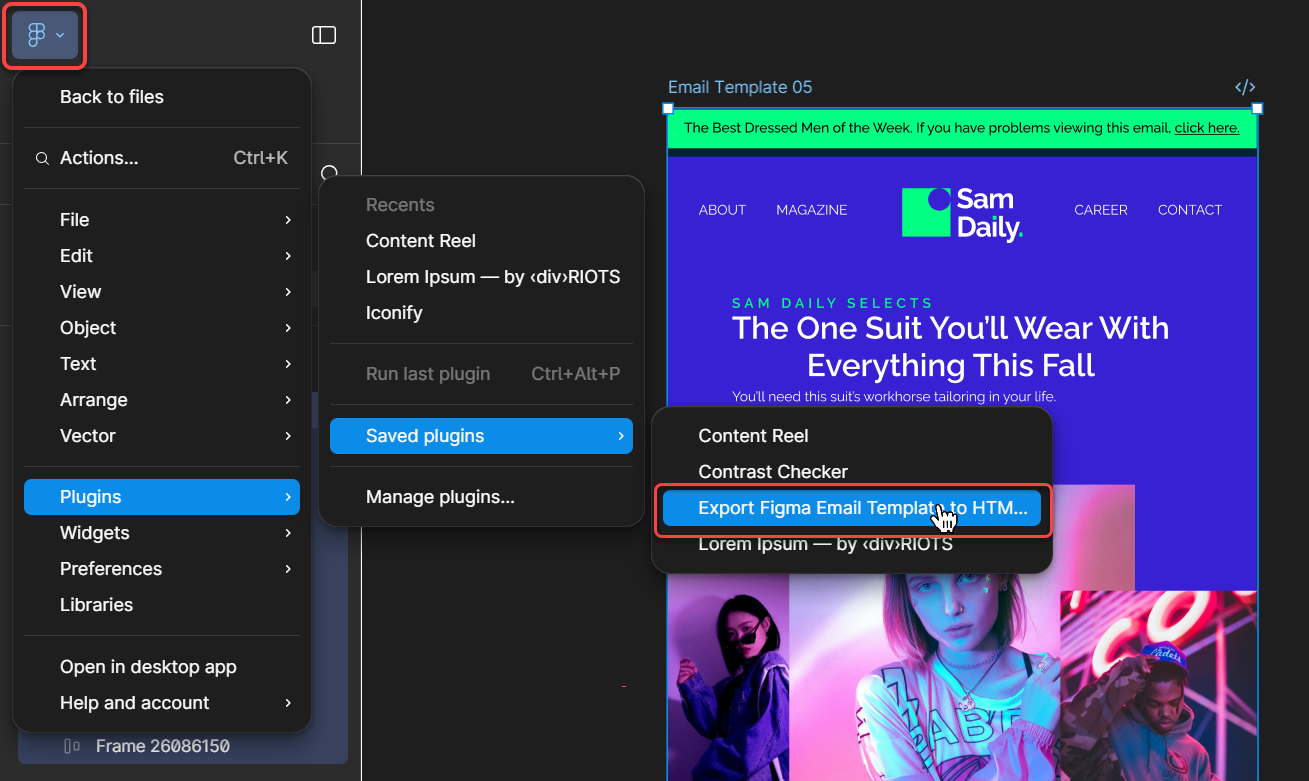 Click the Figma icon in the top-left corner of the app, then navigate to Plugins → Saved Plugins → Export Figma Email Template to HTML.