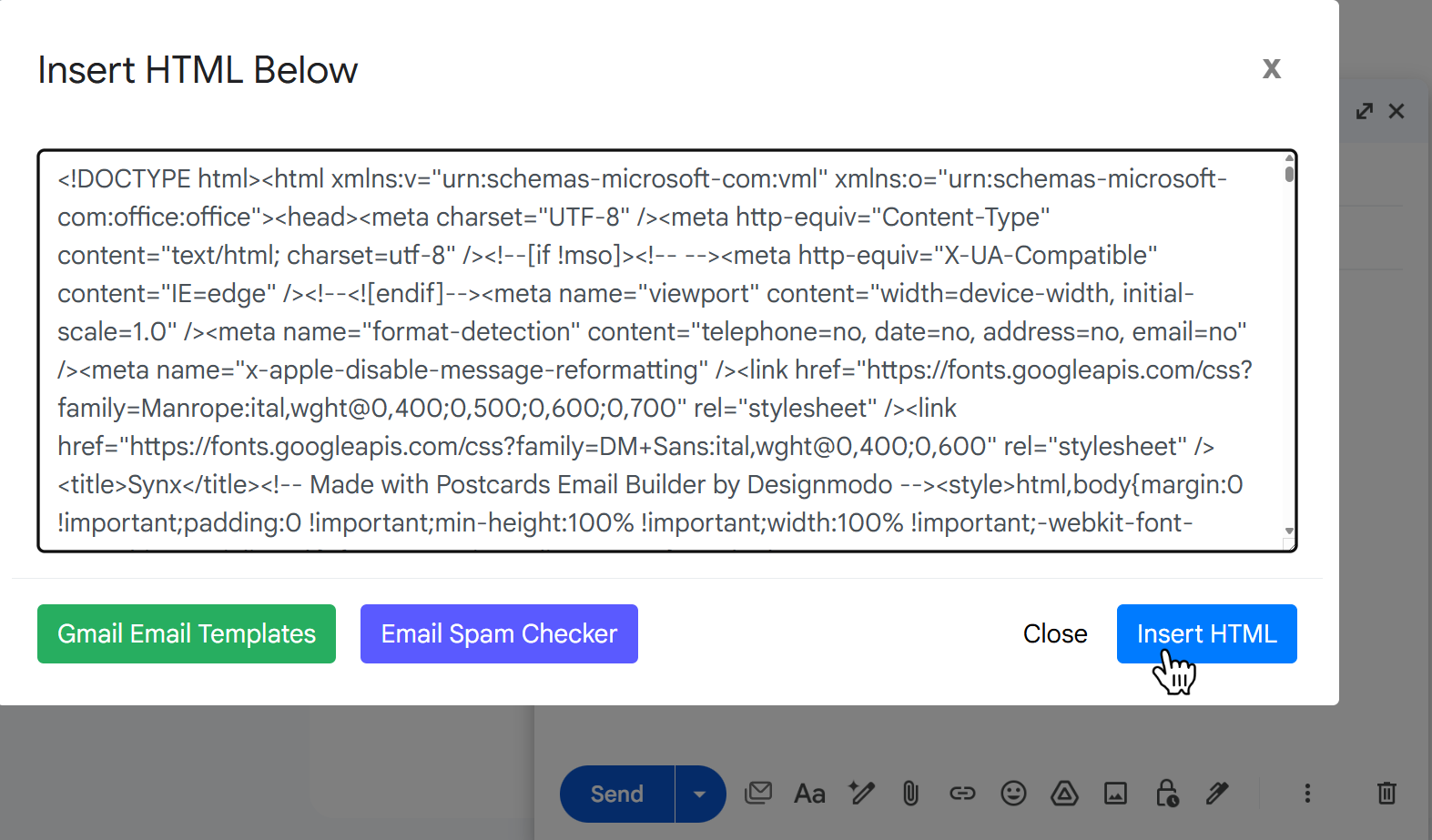 Paste your full HTML into the HTML input field and click the "Insert" button to embed the template into the Gmail compose window.
