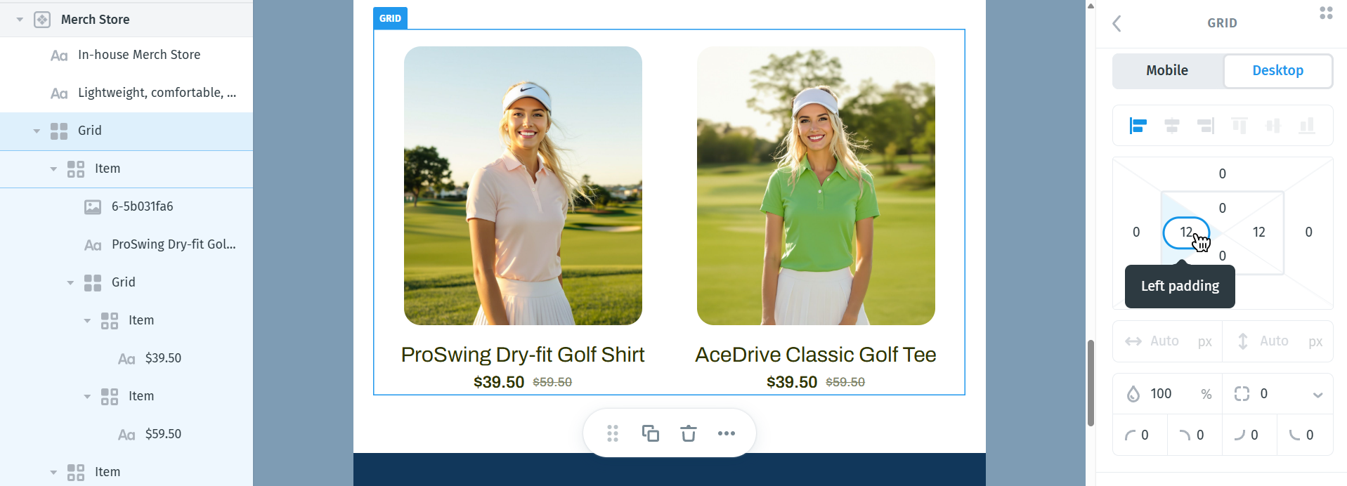 You can adjust the padding and margin of the entire Grid just like any other element in Postcards. Select the Grid itself (not an individual item), then use the right panel to control spacing around and inside the grid.