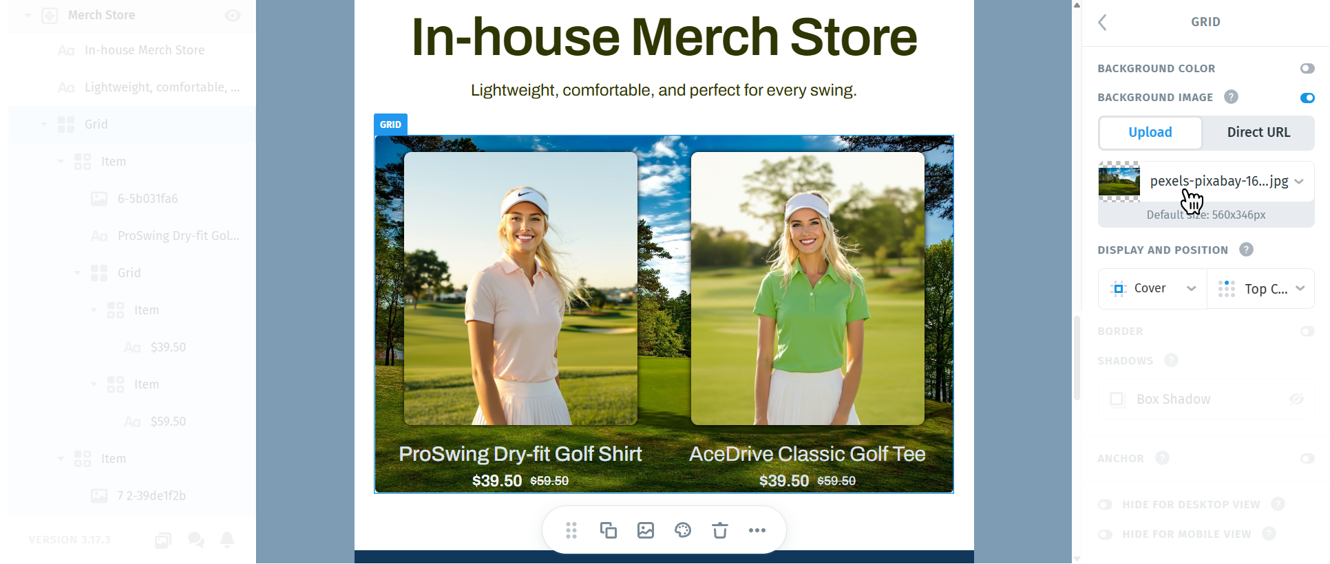 A background image allows you to place an image behind all Grid items, which you can upload from your Image Library or directly from your computer. You can then adjust how the image is displayed and positioned using the available background image settings. This is useful for more visual layouts or branded sections where a simple color isn’t enough. The background image stays attached to the Grid itself, ensuring all items remain aligned and readable on top of it.