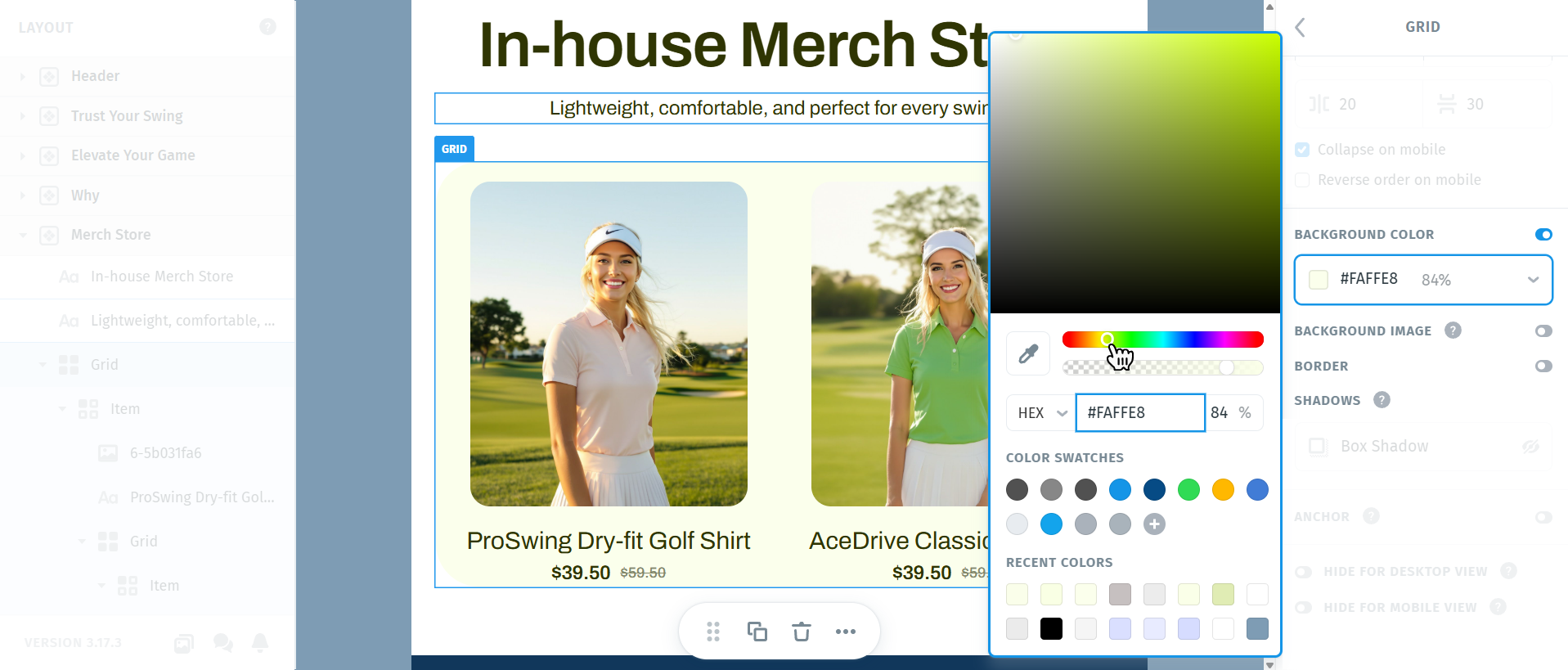 Use a solid background color to create contrast, highlight a section, or visually separate the Grid from surrounding content. You can select any color and adjust its opacity to achieve subtle or more pronounced effects, making it easy to fine-tune how strong the background appears.