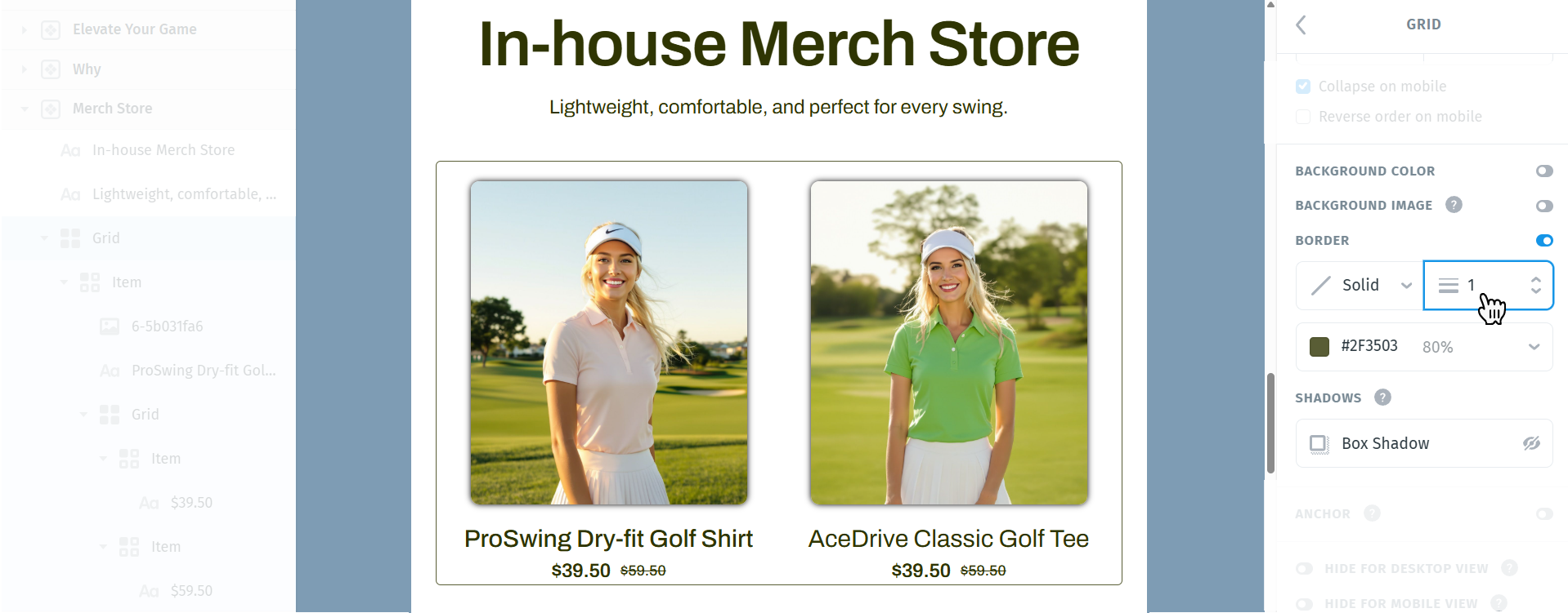 You can also add borders to the Grid’s background to visually separate it from other sections. Border size can be set to a specific value by entering a number, or by clicking the border value field, holding the click, and dragging your mouse left or right to decrease or increase the value.