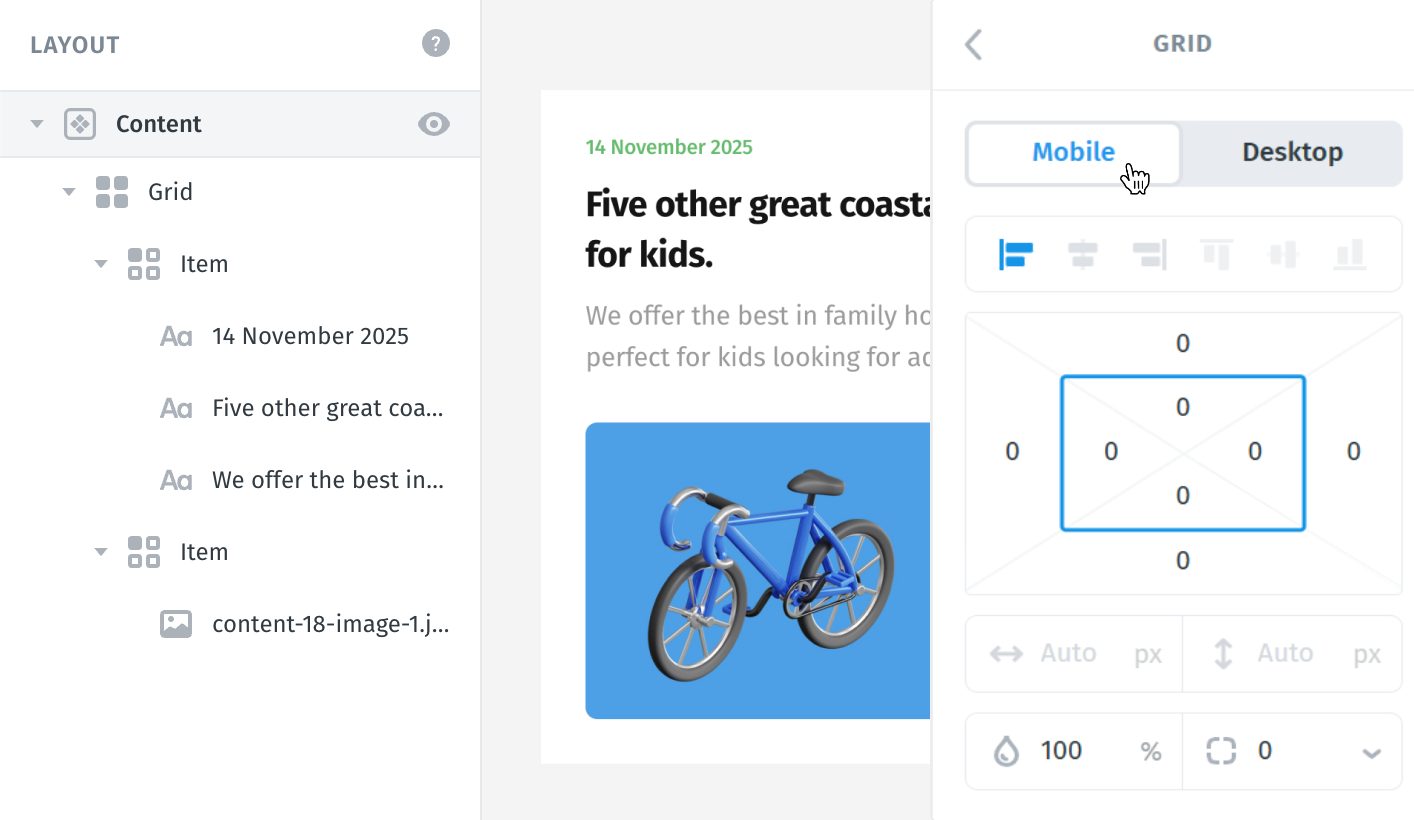 Important: On mobile, the layout typically becomes vertical - items will stack one below the other, with the first item always on top.