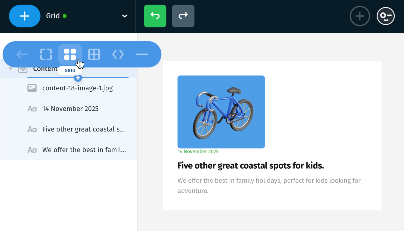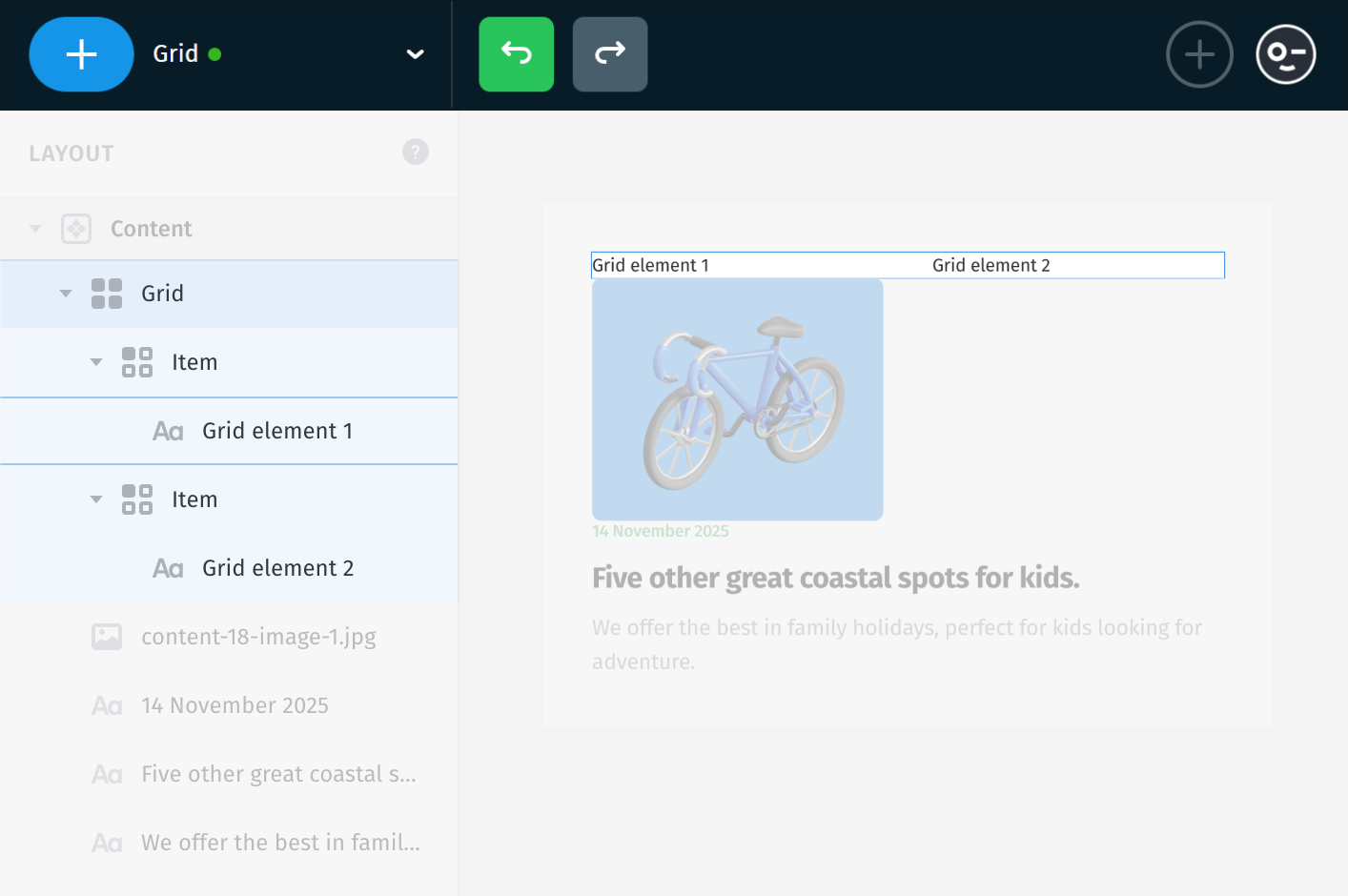 By default, the Grid comes with two items, each containing just a single text placeholder.