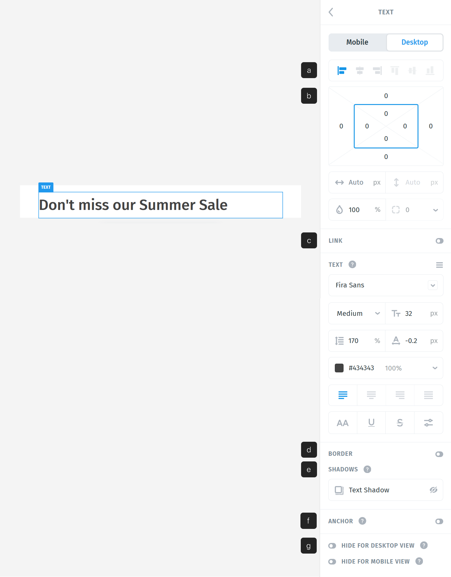 - But any styling adjustments - such as font family, size, color, spacing, alignment, are treated separately between Desktop and Mobile.