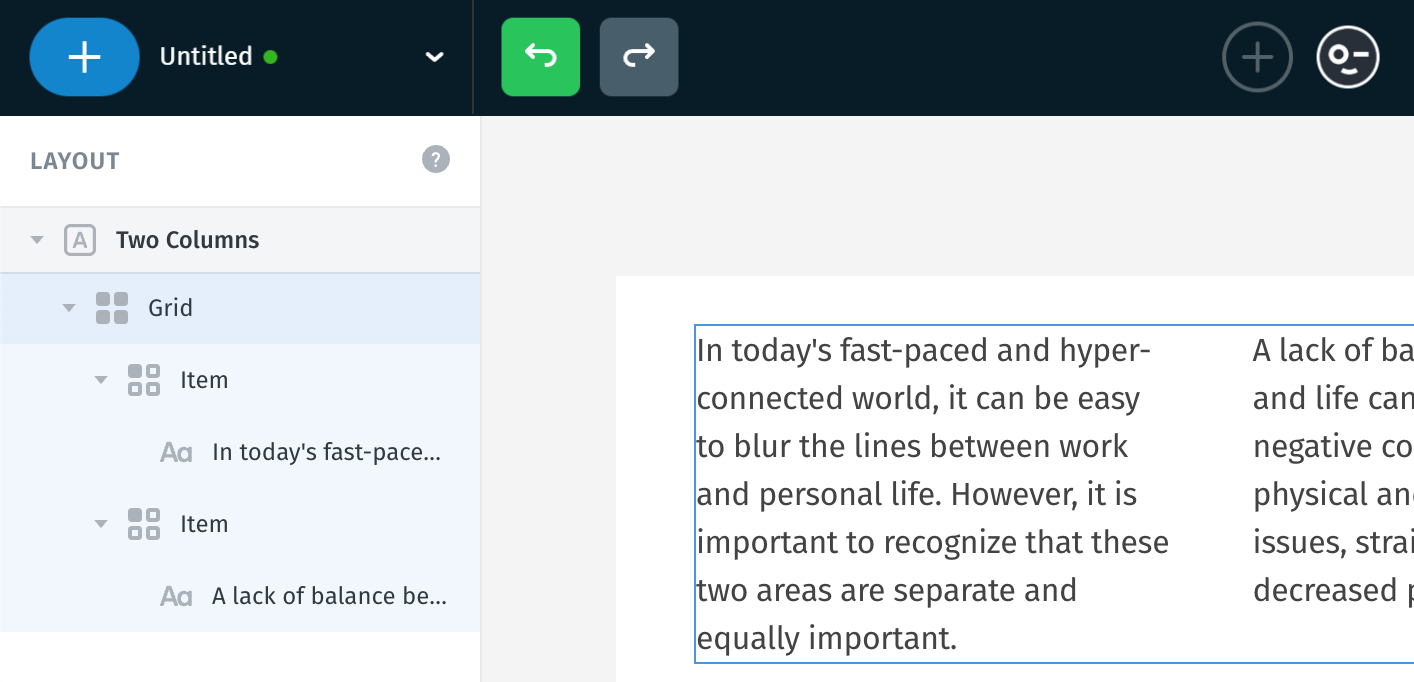 Splits your text into two sections side by side. Makes longer text easier to scan. Helpful for comparisons, lists, or when you want to share two ideas at once.