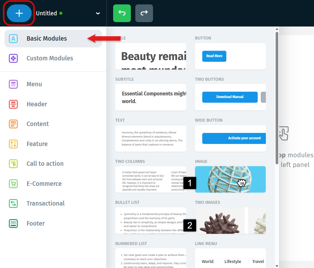 Clicking it will prompt a bubble of available elements that can be inserted in the exact position - for example, you can quickly add another image inside the same module below the existing one.