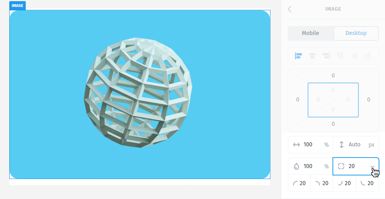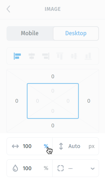There are two main ways to define size: in pixels (px) or in percent (%). By default, image sizing is set to percent (%); to switch to pixel (px) sizing, click the percent (%) icon next to the size value and change it to px.
