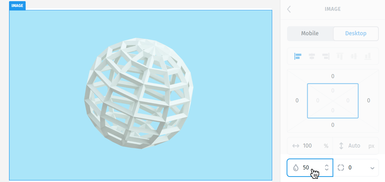 The Opacity setting controls how transparent an image is. You can type a value or drag left/right to decrease or increase the percentage.