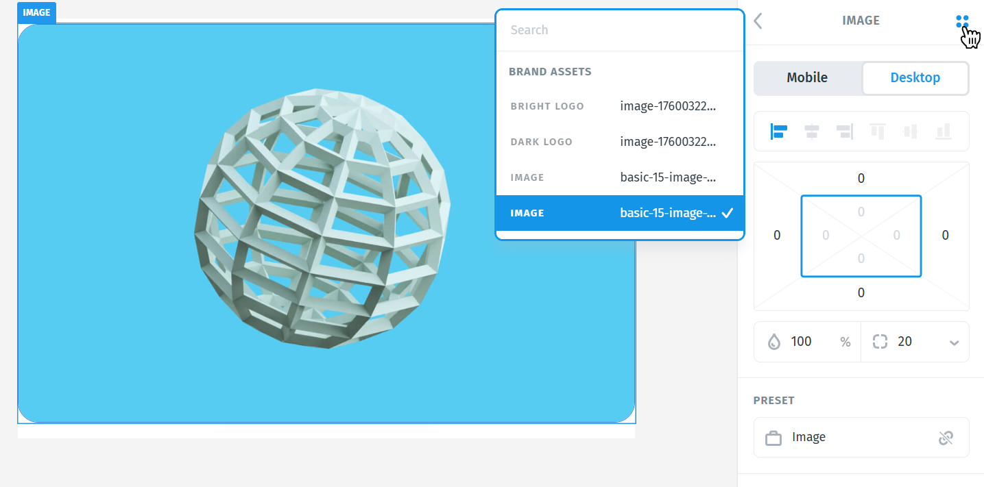 When you’re working with images, you can now quickly access all the assets you’ve added to your Brand Preset. Simply select any image element in your project, and you’ll see a four-dot button that opens your Brand assets in the top-right corner of the editor.