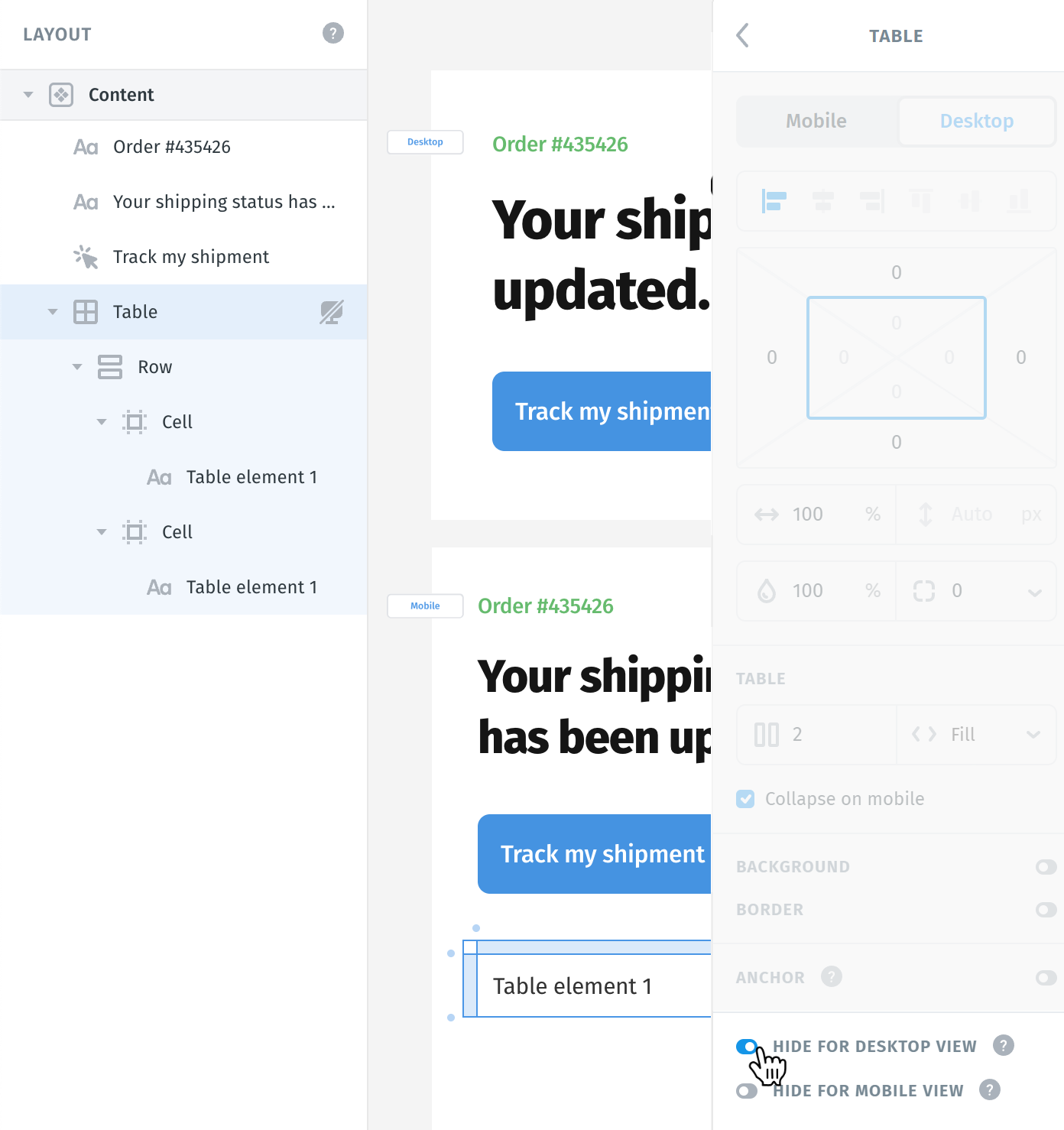 Sometimes, based on your design or client needs, you may want the table to appear only on mobile or only on desktop.