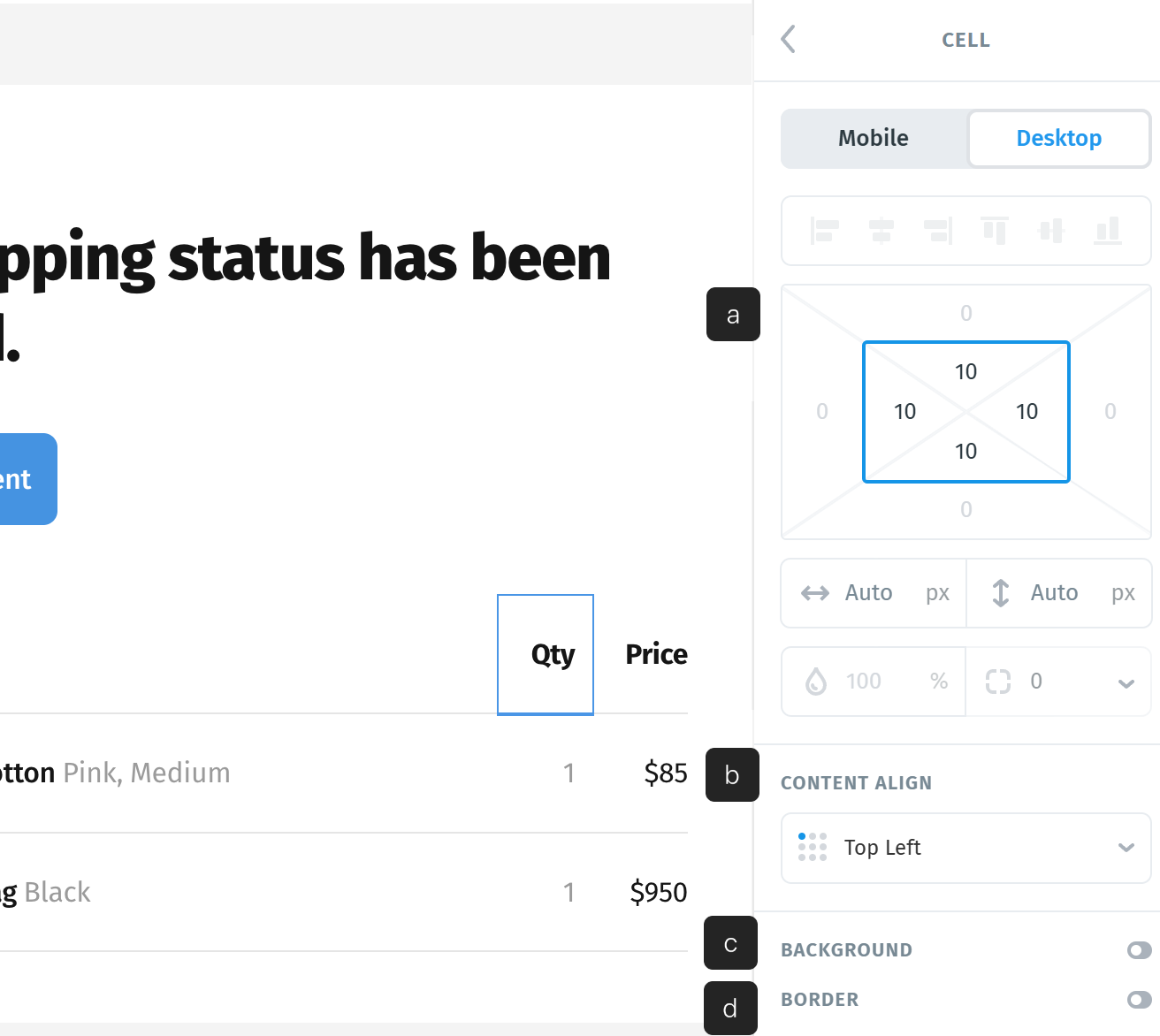 A cell can have its own background color (c) and border (d). When applied, these override both the row and table styles - this is helpful when you want to highlight a single cell, draw attention, or visually differentiate it from others.