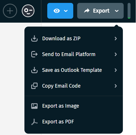 The eye icon opens the Preview & Share panel, and the airplane icon lets you send a direct test email to your inbox. This feature allows you to review your design before exporting or sharing it with others.