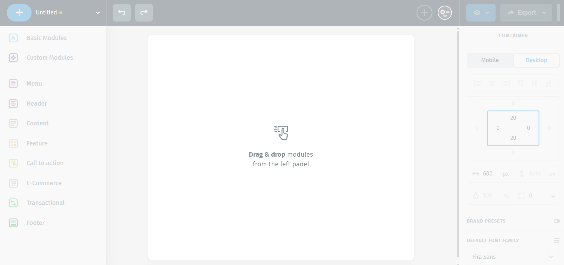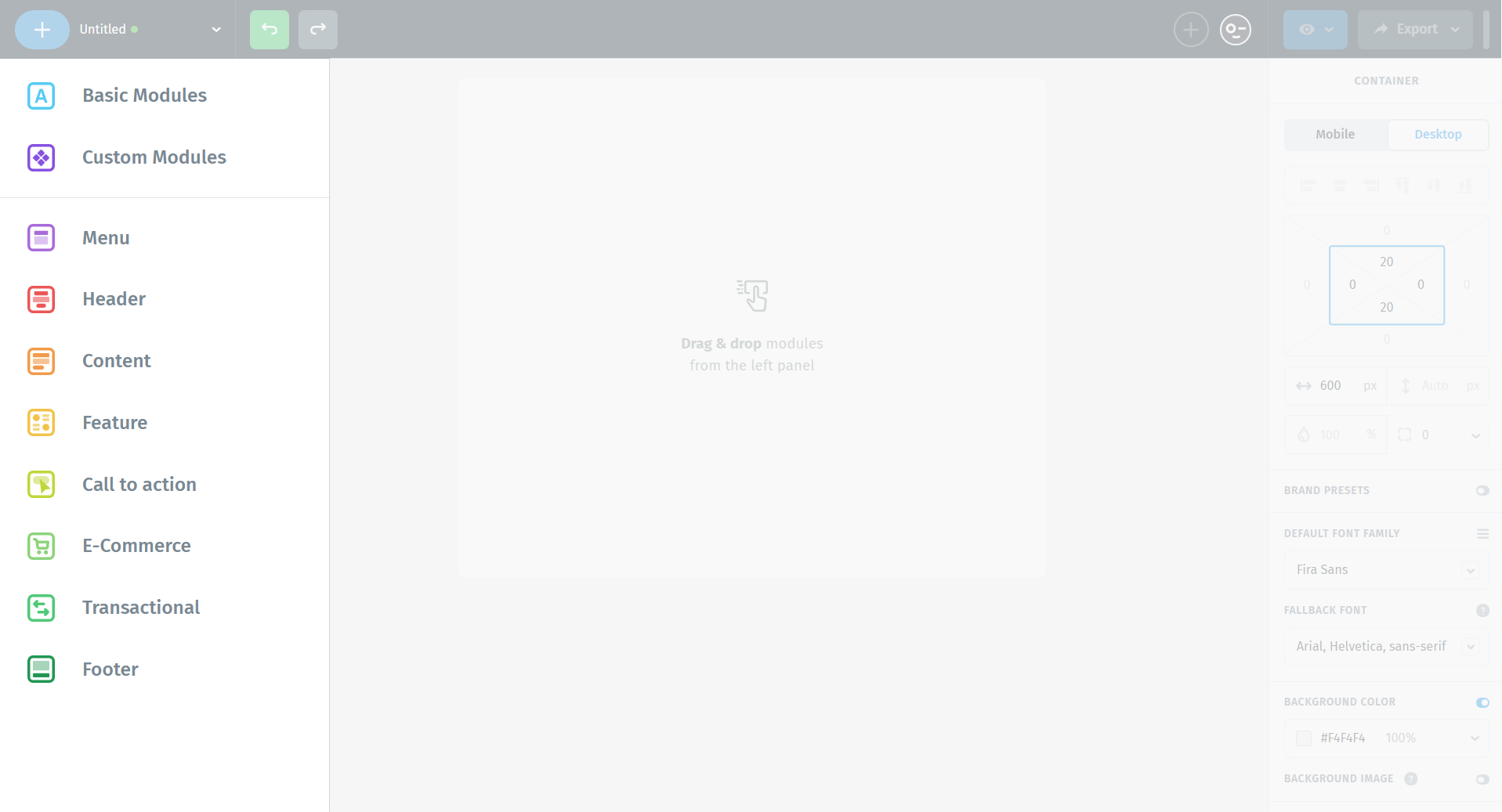 The Top Bar in Postcards gives you quick access to your main project tools, adding modules, managing projects, previewing your design, and exporting your finished email.