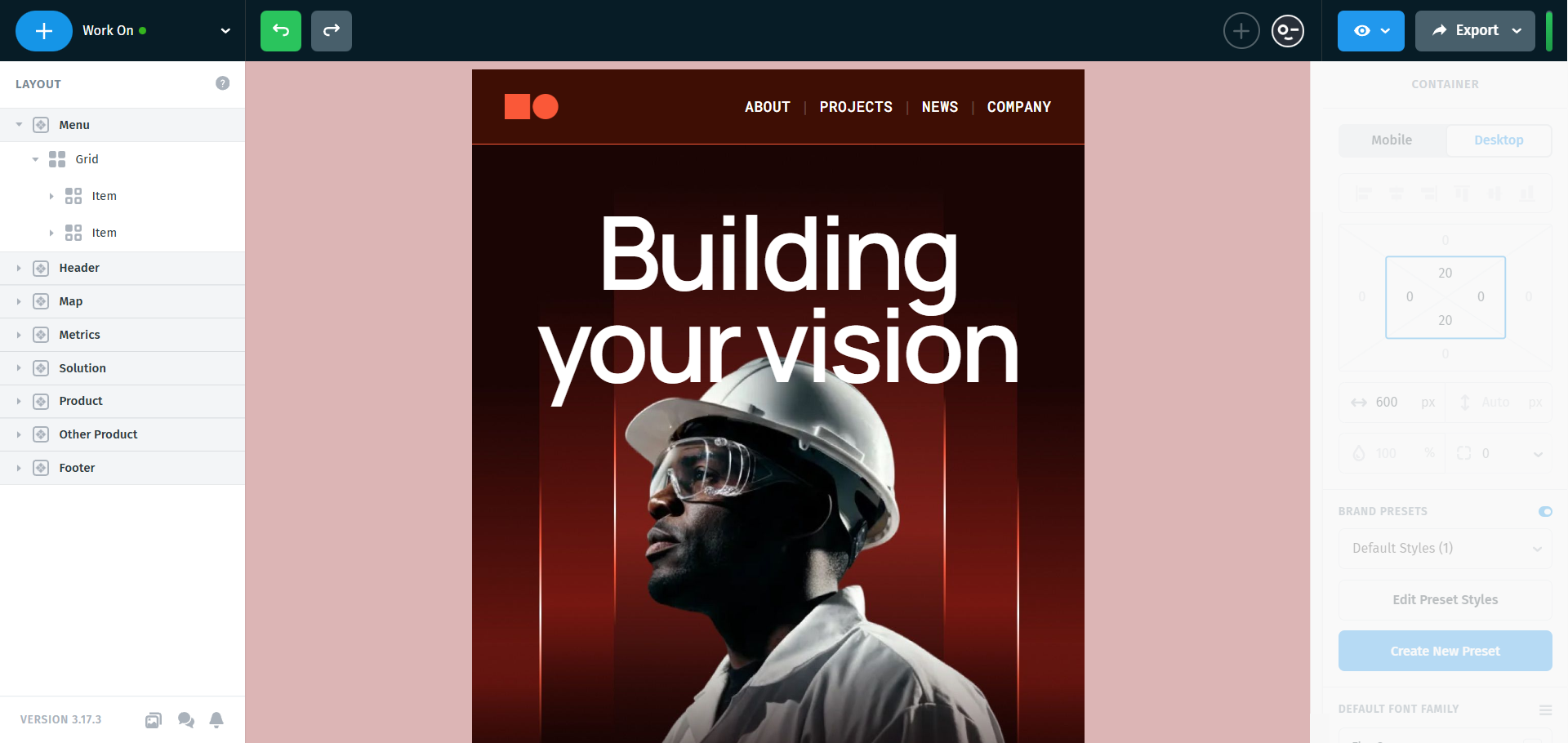 From here, you can drag and drop sections such as Headers, Content, Features, Footers, and more directly into your canvas.