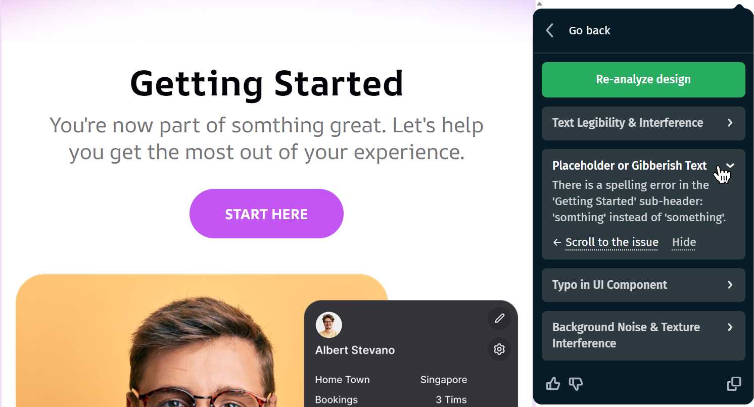 Click any suggestion to expand it for a more detailed breakdown of the identified problem. When you select a suggestion, the editor will automatically navigate to the relevant section on the canvas, making it easy to locate and fix the issue.