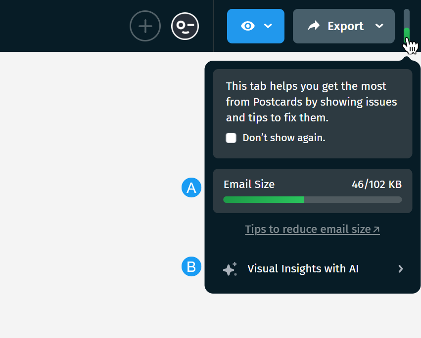 The Project Health Bar is your built-in quality control panel in Postcards. Located next to the Export button in the top bar, it provides a quick indicator of your email size so you can immediately see how close you are to the recommended limit, along with a detailed AI-powered analysis of your email’s structure, all before you send or export.