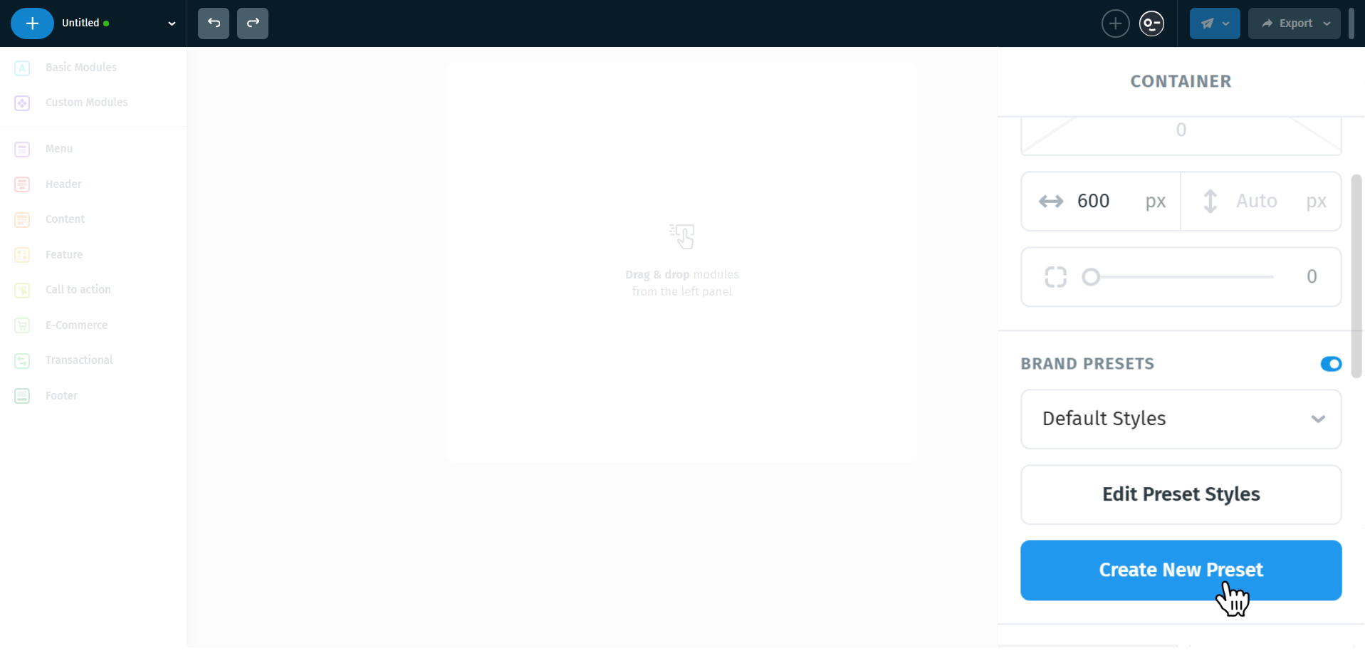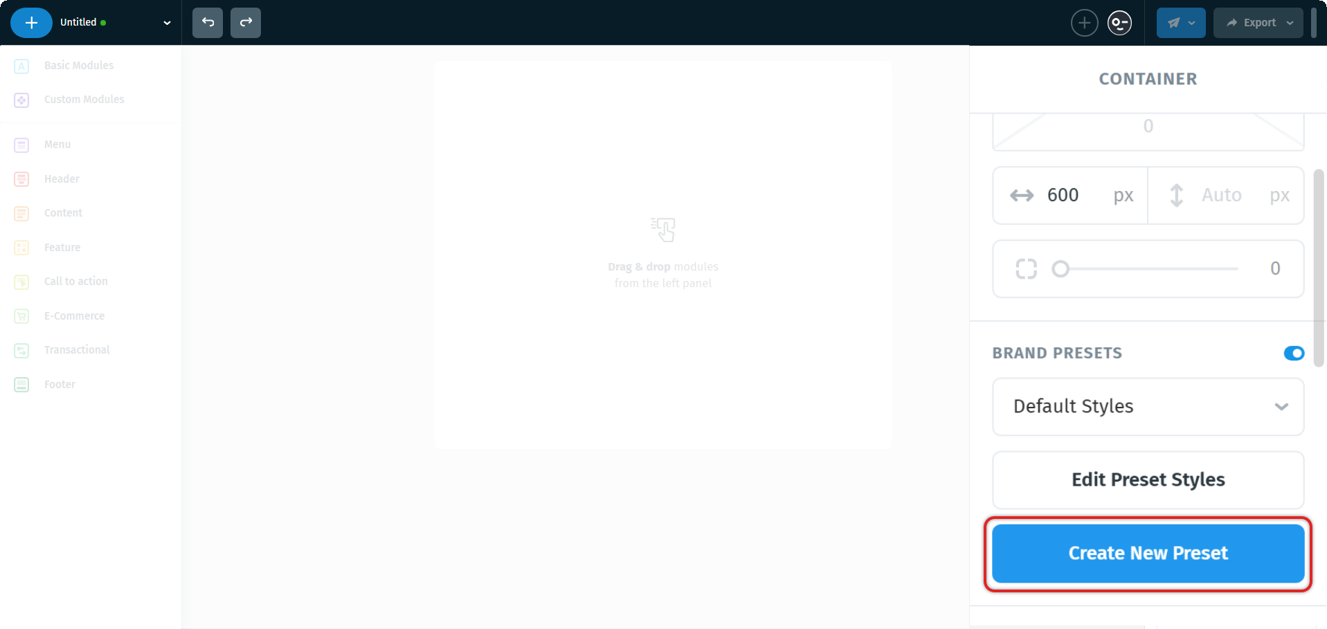- On the right panel, find Brand Presets and toggle it ON. Click Create New Preset.