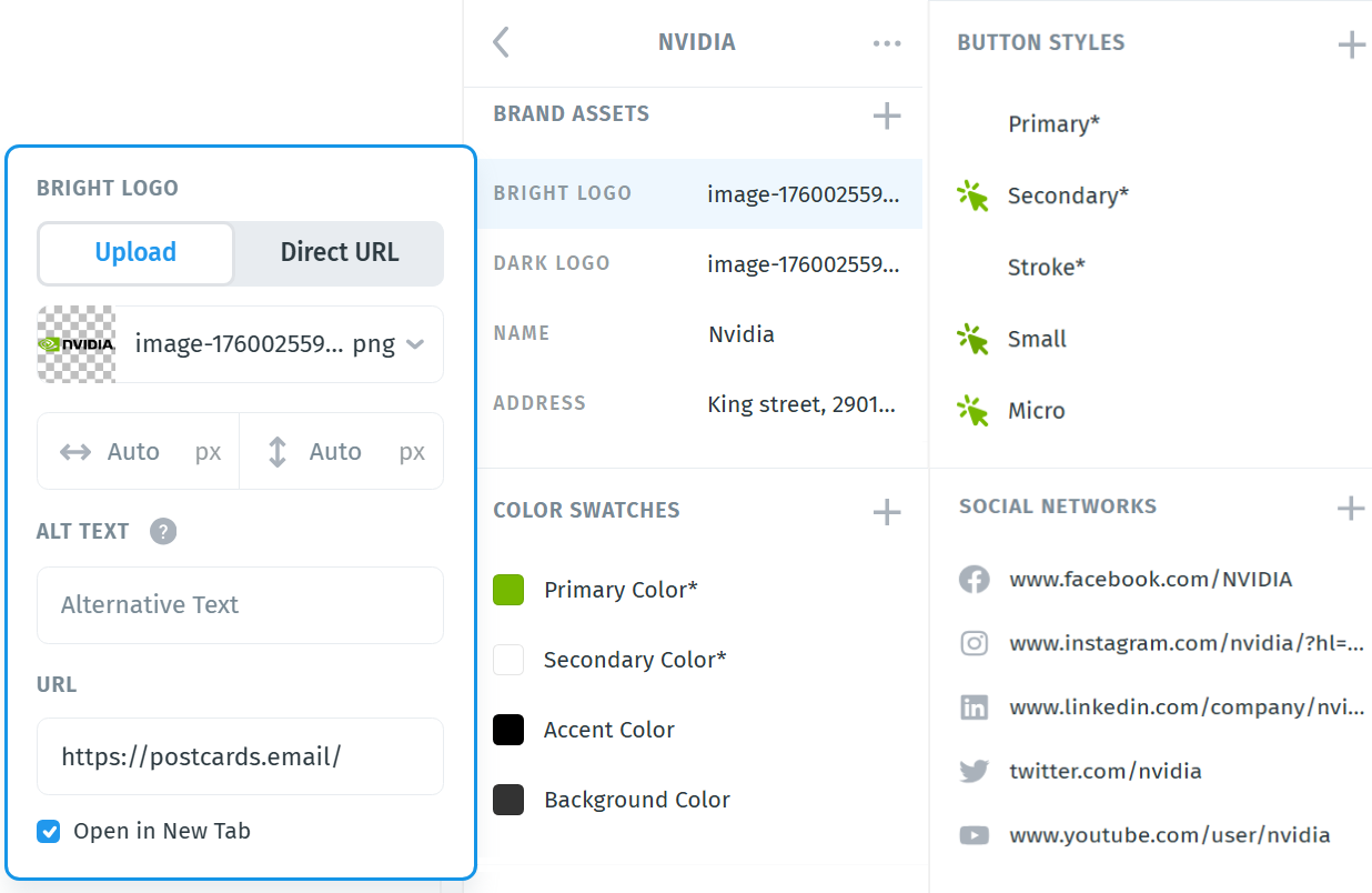For example, if your company decides to change its primary color from blue to red, updating the Brand Presets will apply that change instantly across all your saved projects and Postcards pre-made modules. This ensures design consistency and speeds up your workflow.