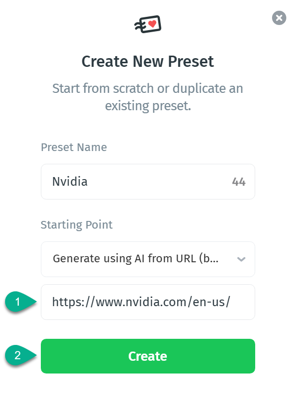 - In the Create New Preset window, enter a Preset Name (i.e. your company or product name).