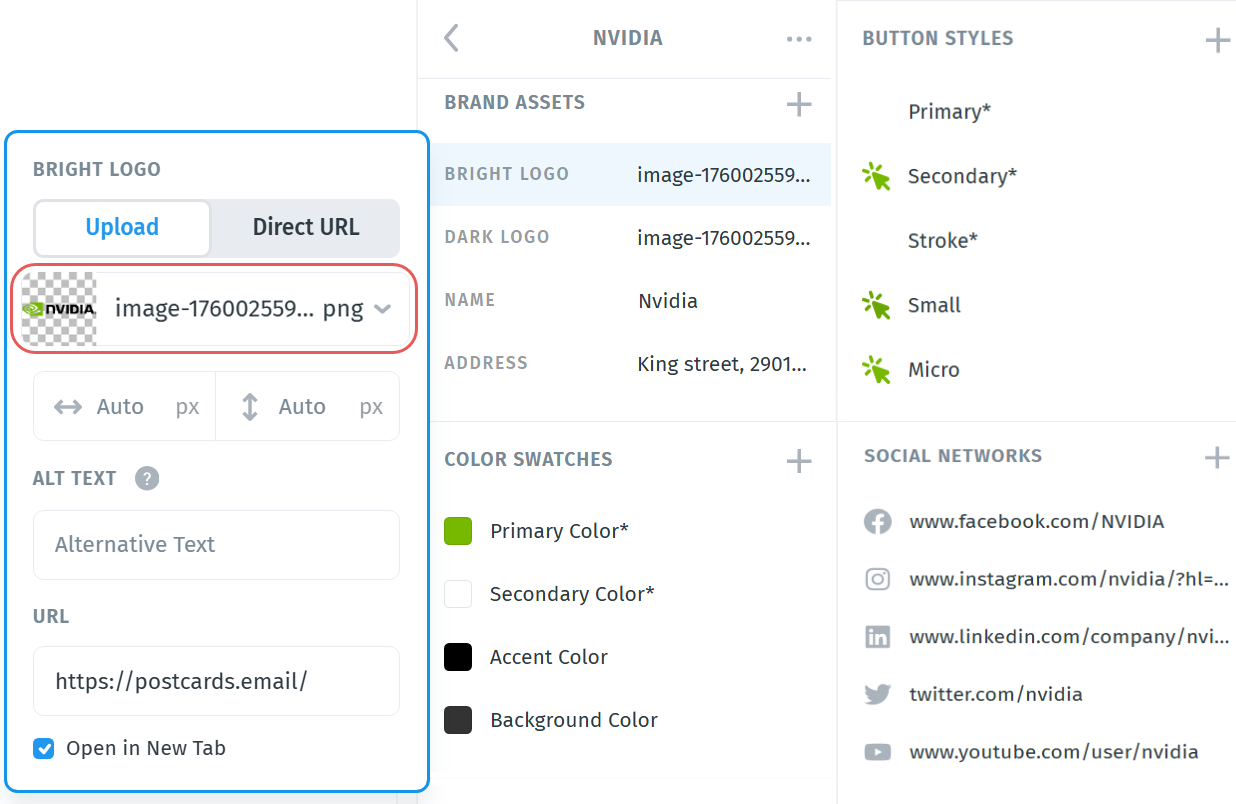 You can also press the “+” icon to add additional Brand Assets. By default, this will insert an image, which you can replace with a custom image or switch to a direct URL.