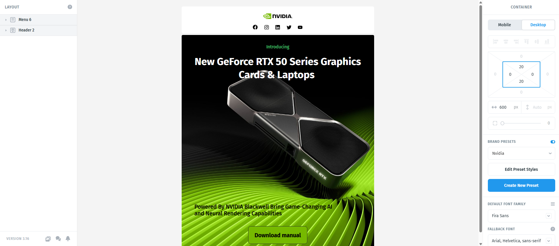 Once edited, you’ll see that all pre-made modules automatically update with your new assets - saving you time and ensuring brand consistency.