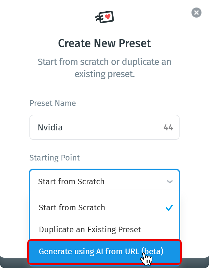 - Open "Starting Point" and choose Generate using AI from URL (beta).