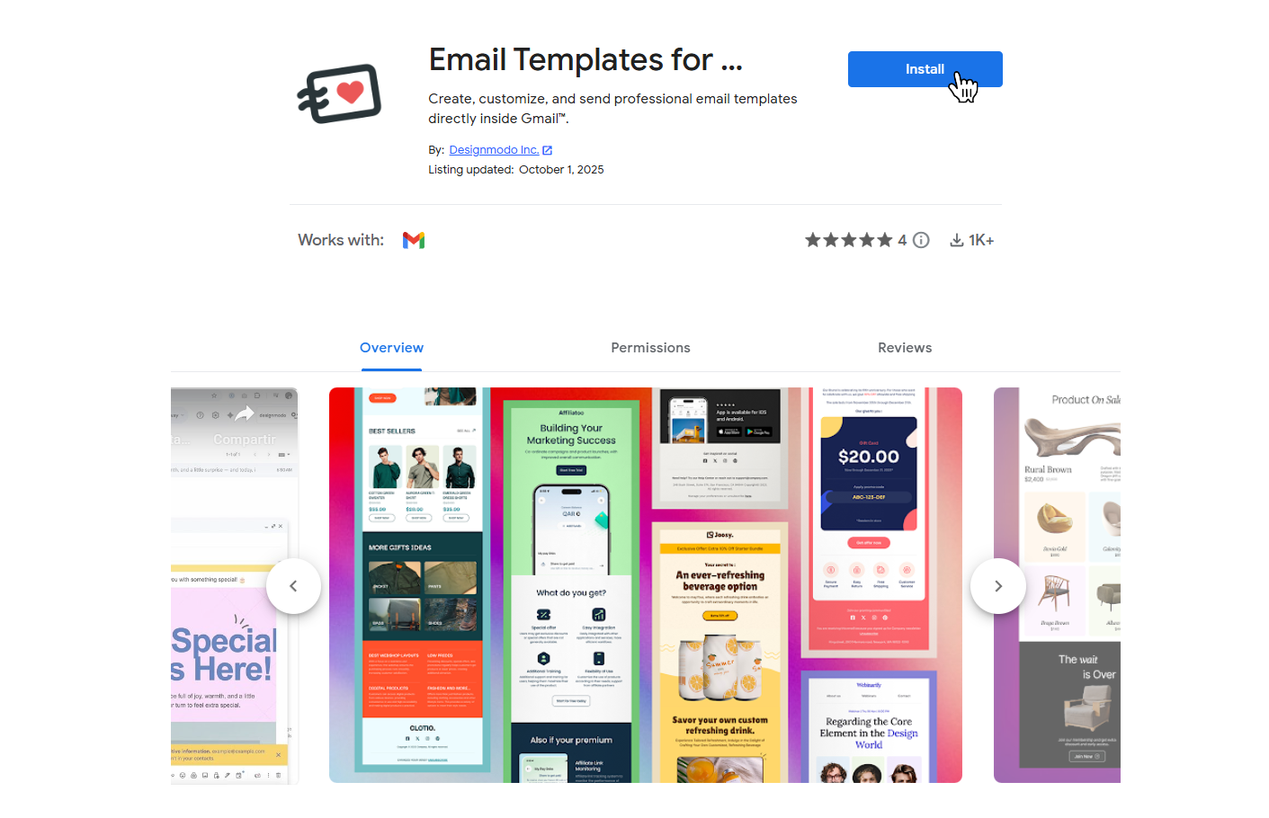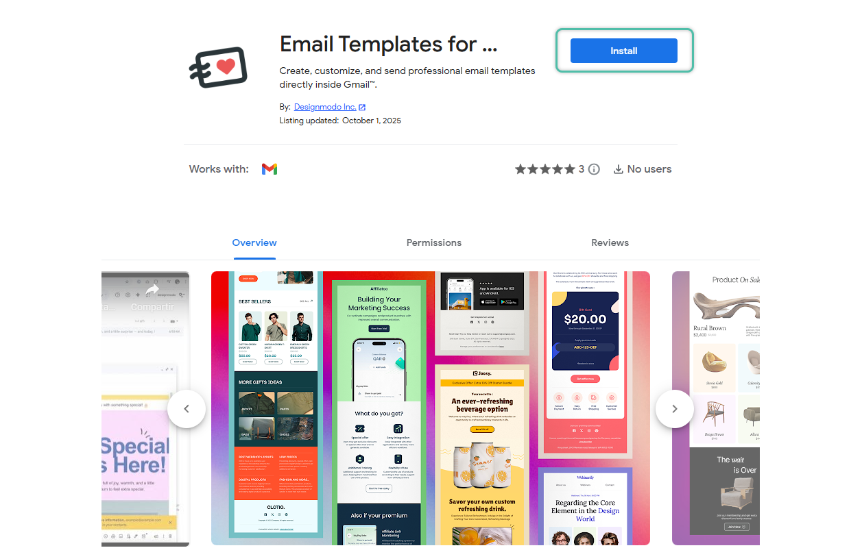 - Open the app page by using this Direct Link or open the Google Workspace Marketplace Here and search for “Email Templates for Gmail by Designmodo.”