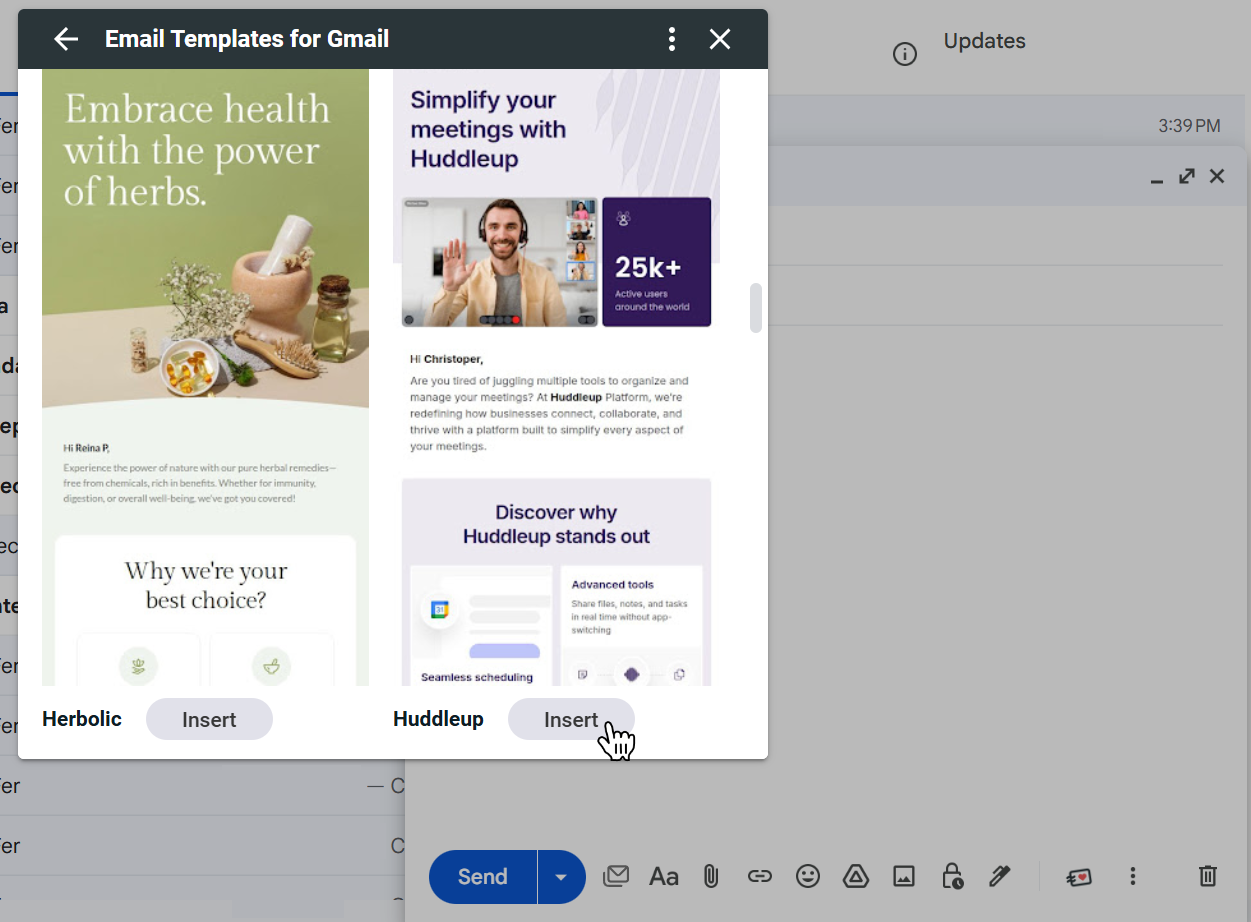 - Select a template to preview, then click Insert to drop it into your draft.