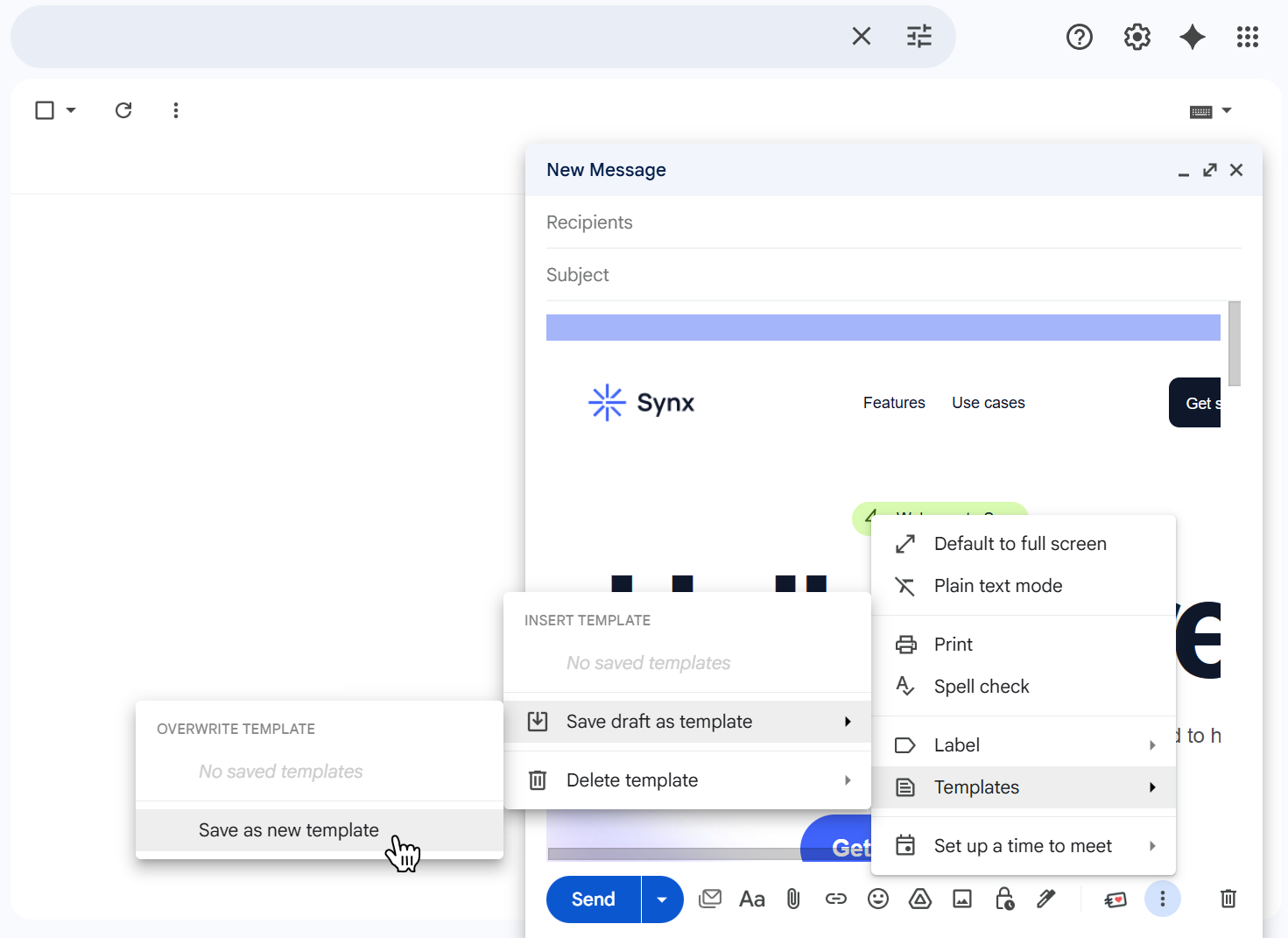 - Click the three-dot menu in the compose window → Templates → Save draft as template → Save as new template.