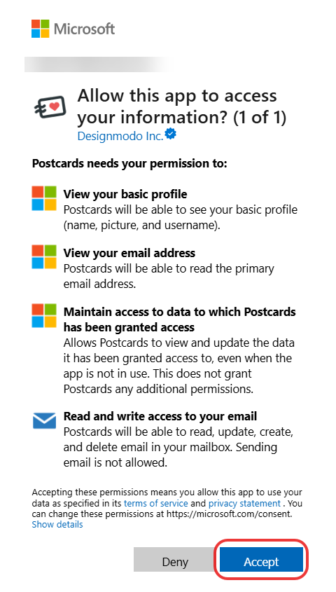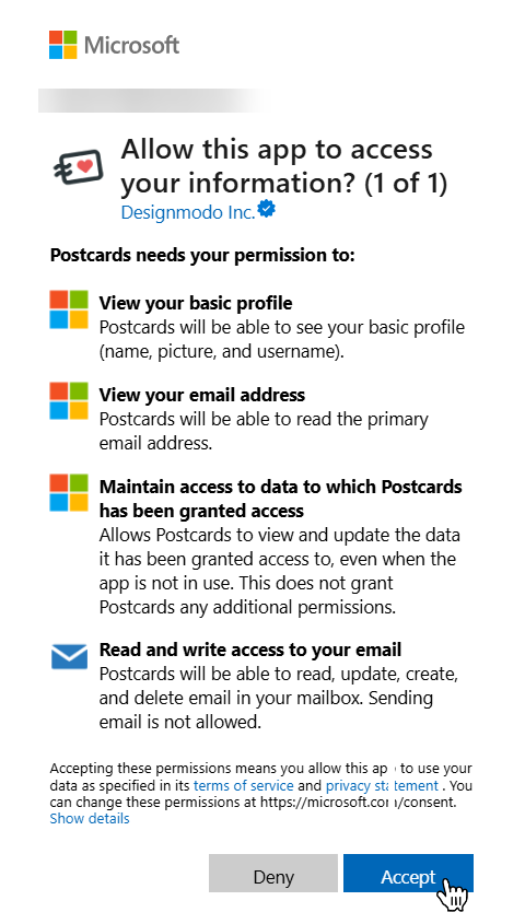 - A Microsoft sign-in/consent window will open. Sign in with the Microsoft account you use for Outlook Live. Review the requested permissions and click Accept to authorize so Postcards can deliver the template into your account.