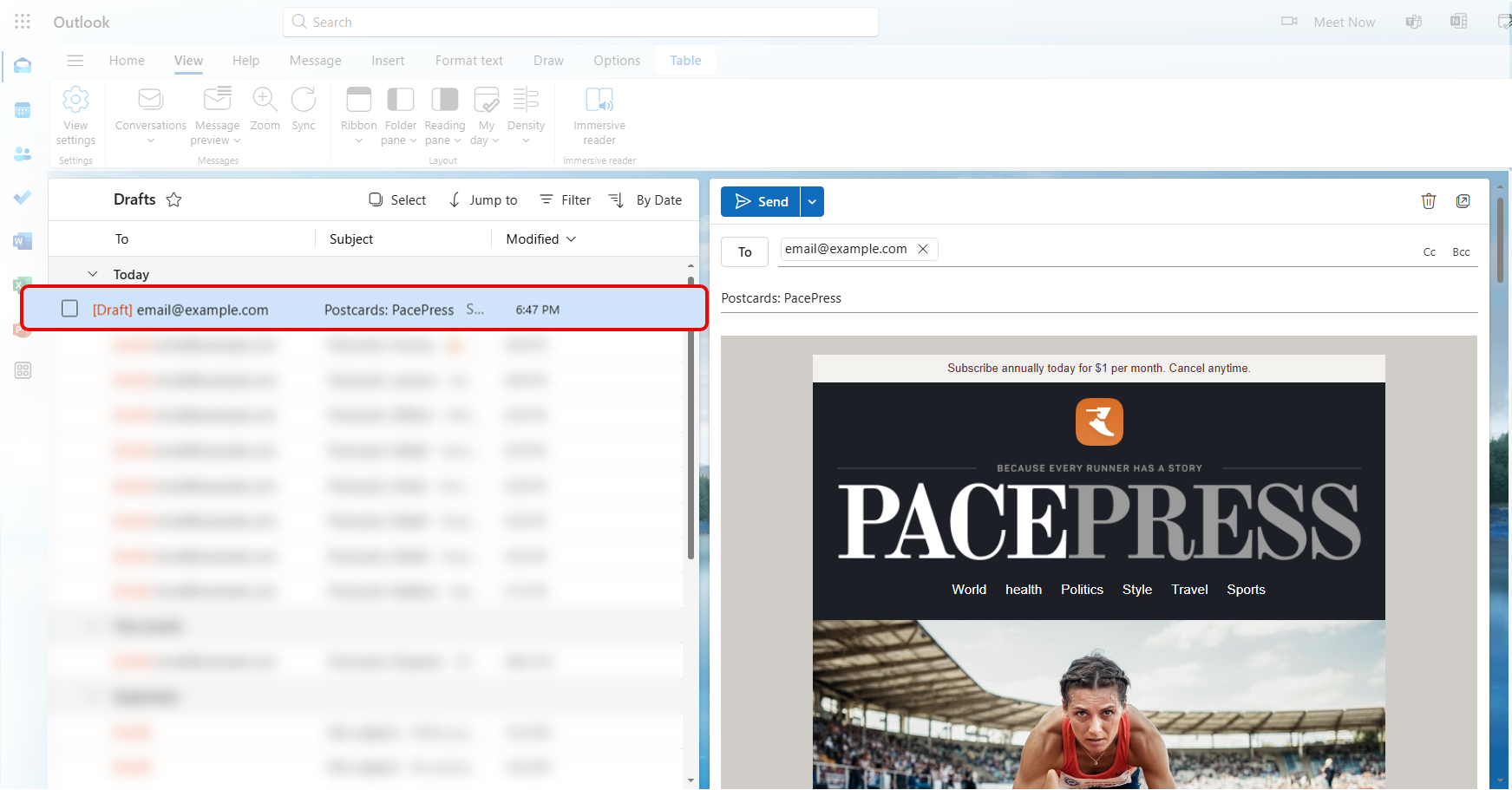 - After clicking Open in Outlook, you’ll be taken directly to your Outlook Live Drafts folder, where your exported email will appear as a ready-to-send draft. From there, you can review the message, make any final edits, add recipients, and send it right away.