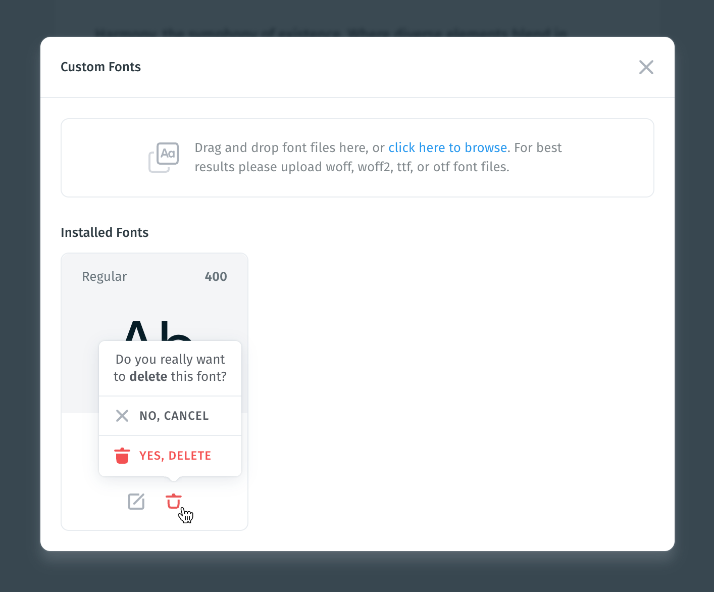 You can edit or delete your uploaded fonts using the same Custom Fonts popup.