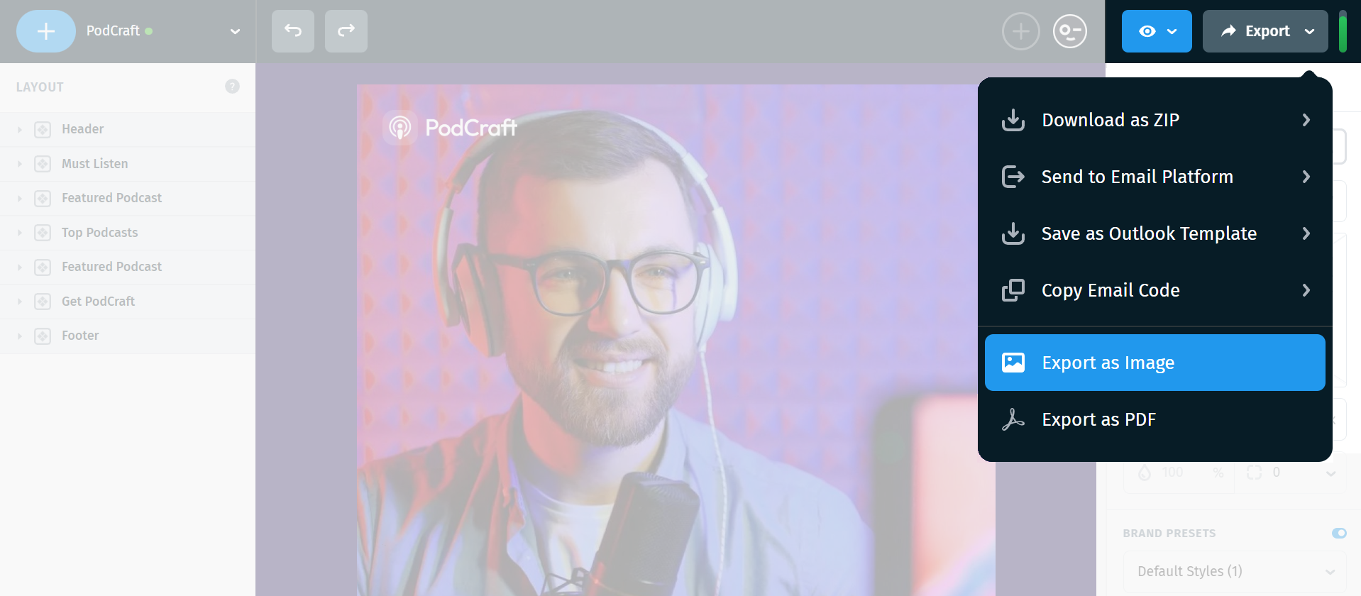 The Export as Image option saves your entire email design as a static image file. This export is ideal for previews, presentations, social sharing, or design reviews where the email doesn’t need to be interactive.