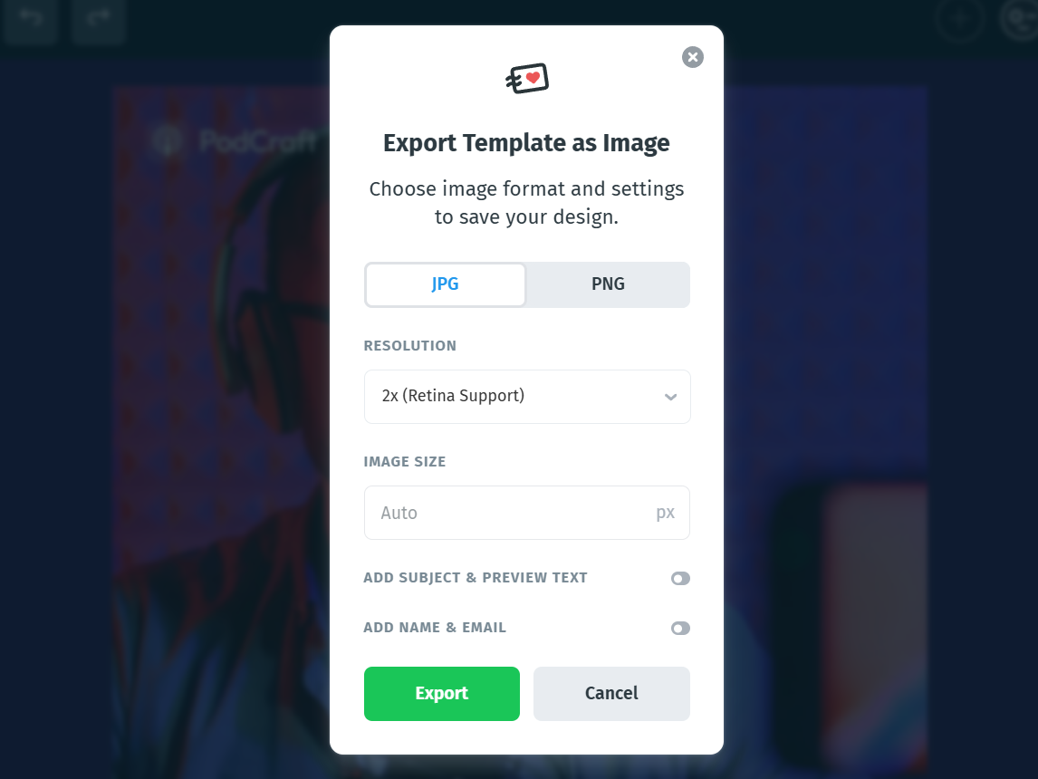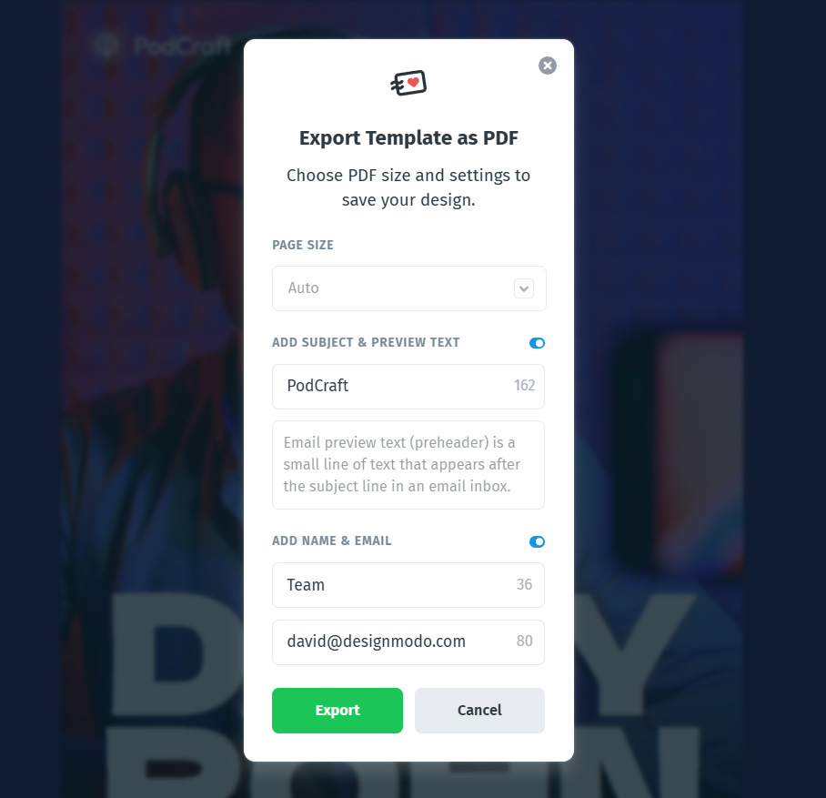 - Subject line, preview text, and sender details are optional and can be included in both Image and PDF exports.