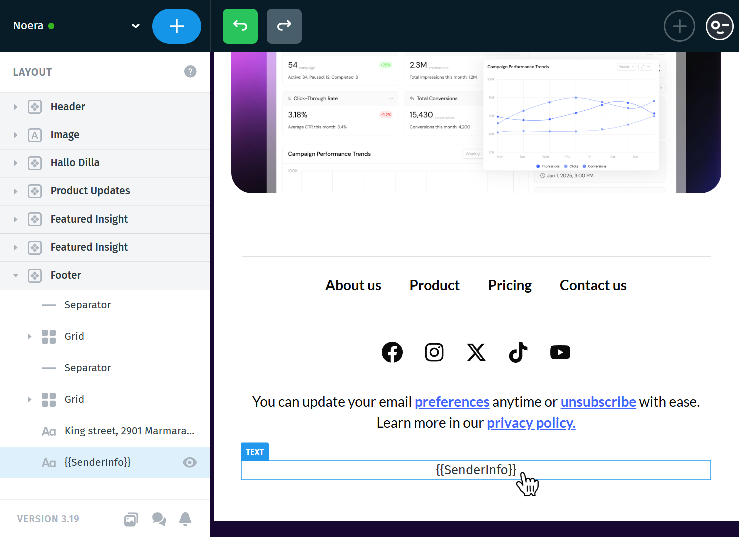 In your template, scroll down to the footer section. This is typically where sender information and unsubscribe links are placed in email templates.