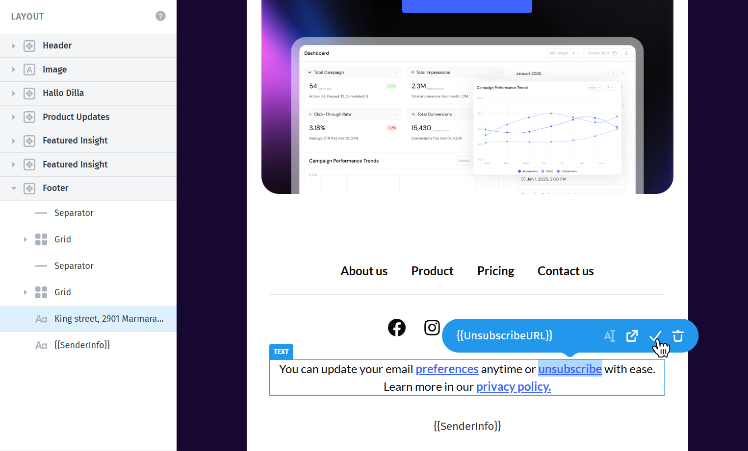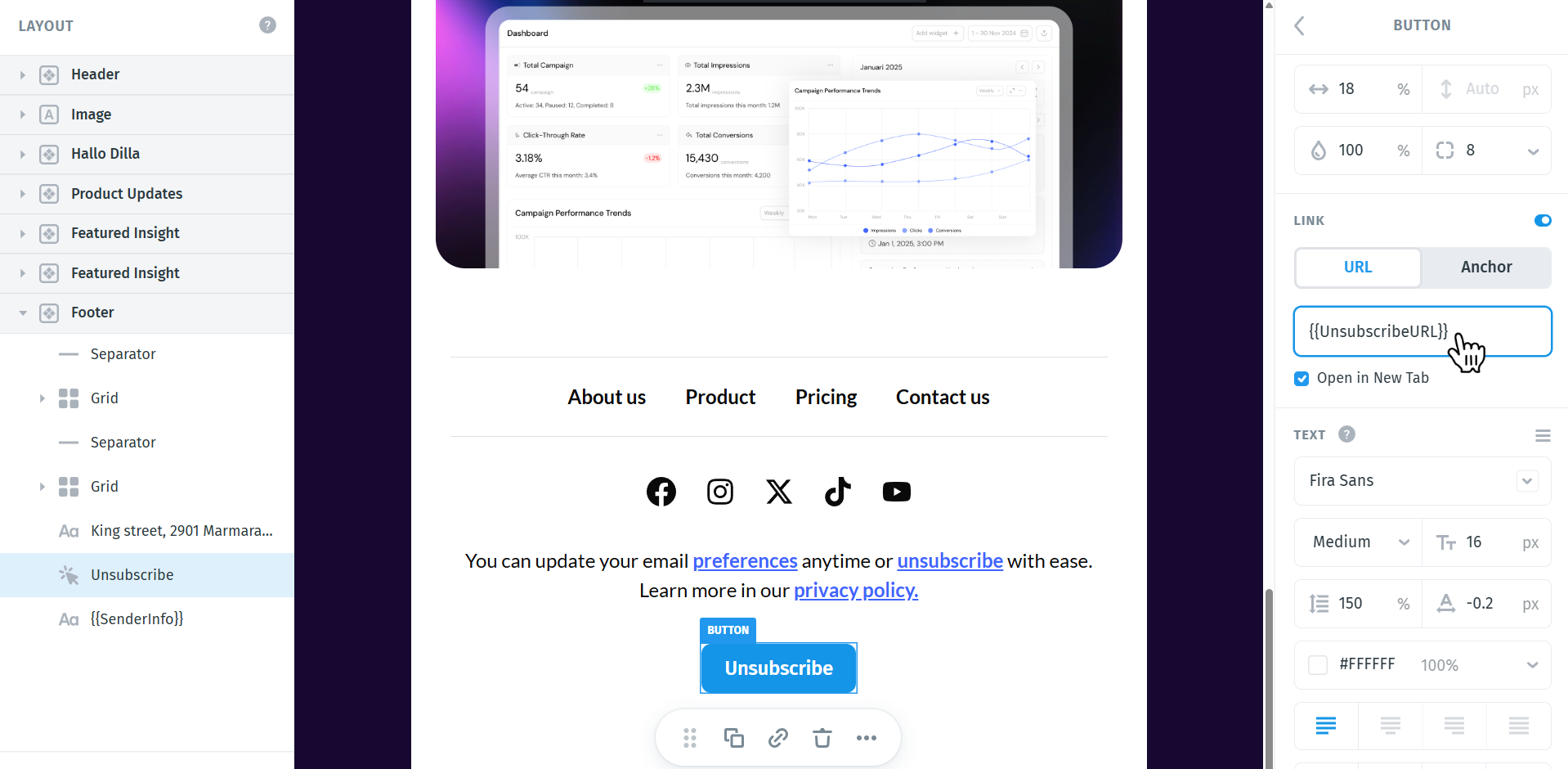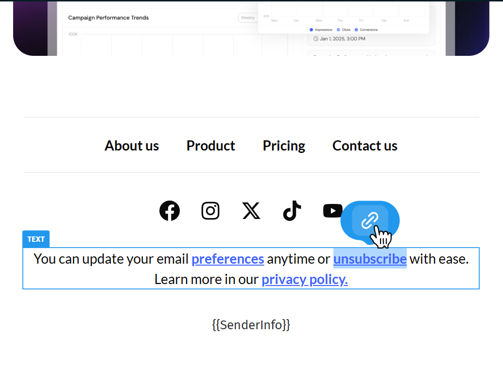 Next, add an Unsubscribe text link or button to your footer.