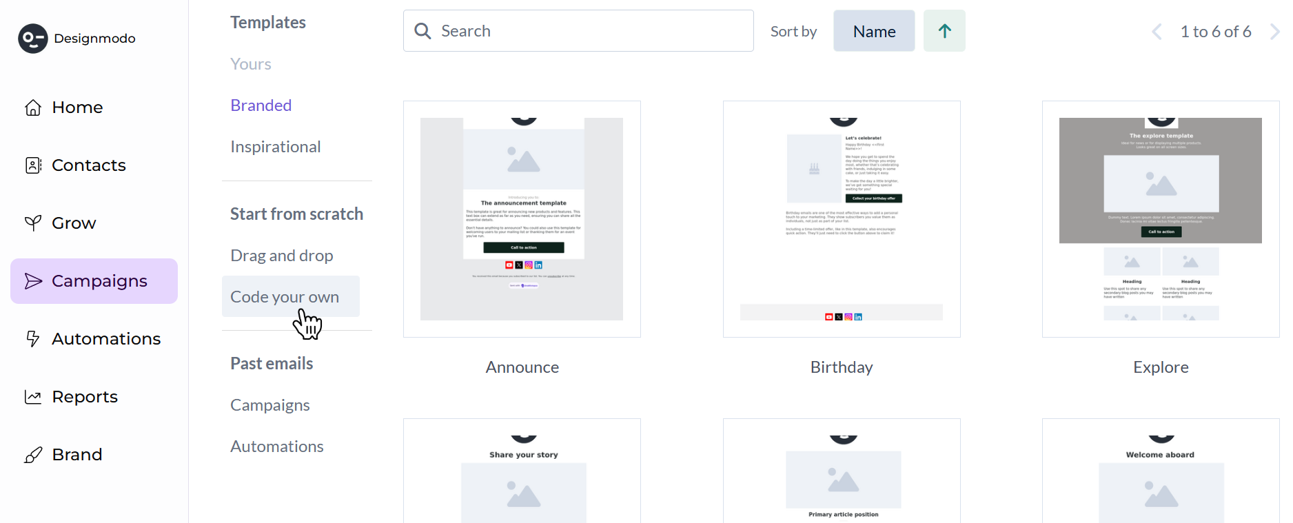 Select Code your own from the left panel. This option allows you to use your own HTML email template instead of the drag-and-drop builder.