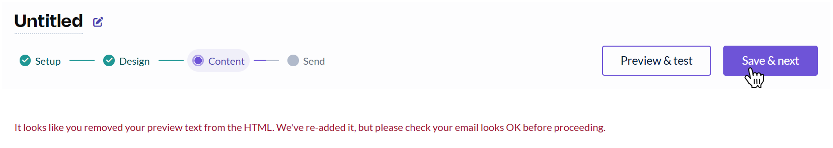If this message appears, simply click Save & Next again to continue, as the preview text code has already been inserted automatically.