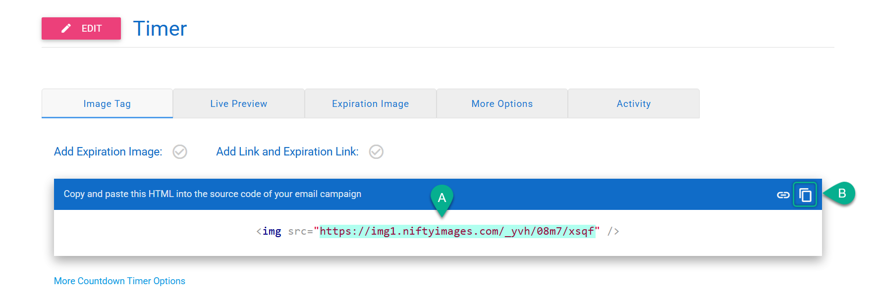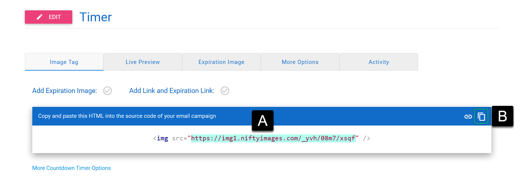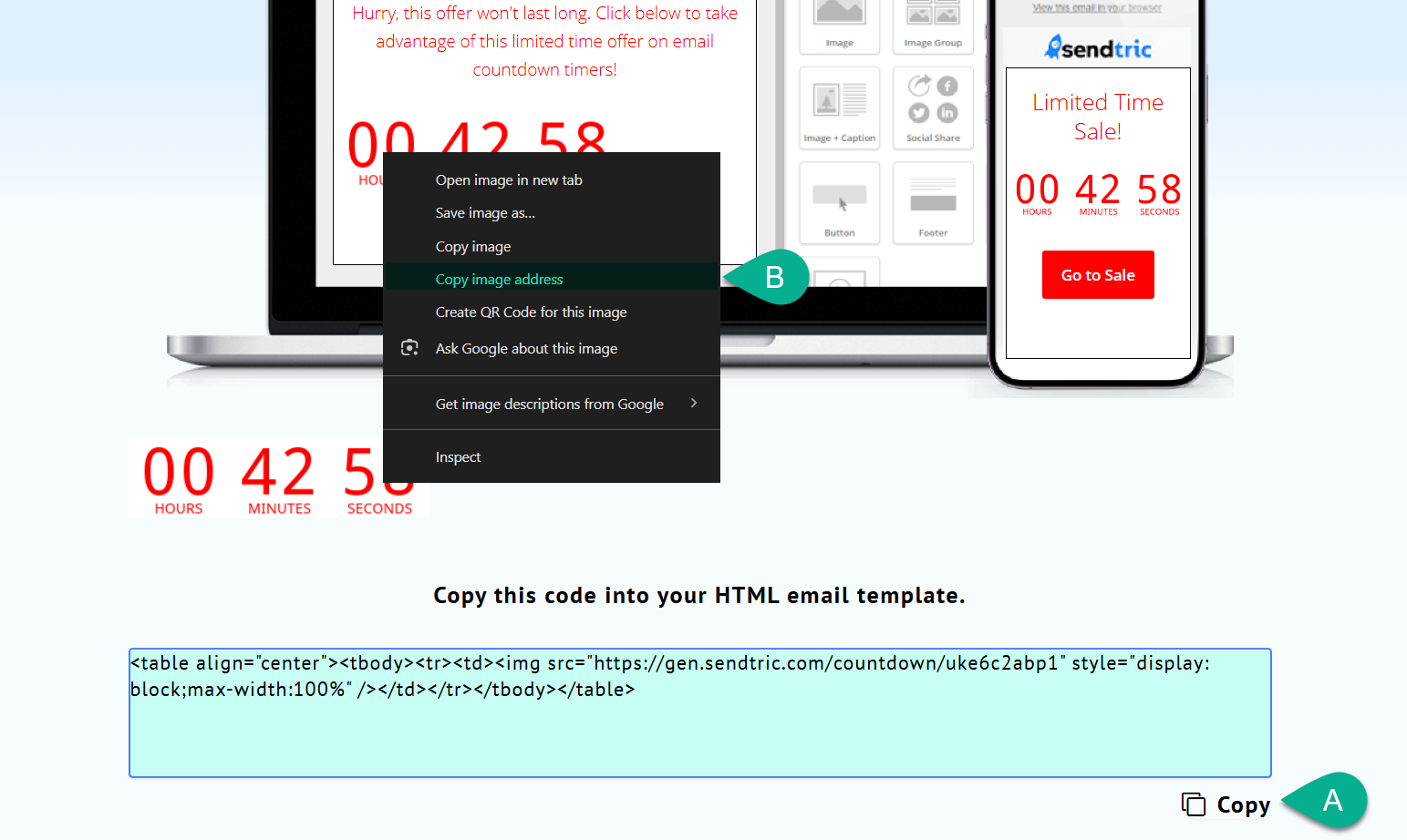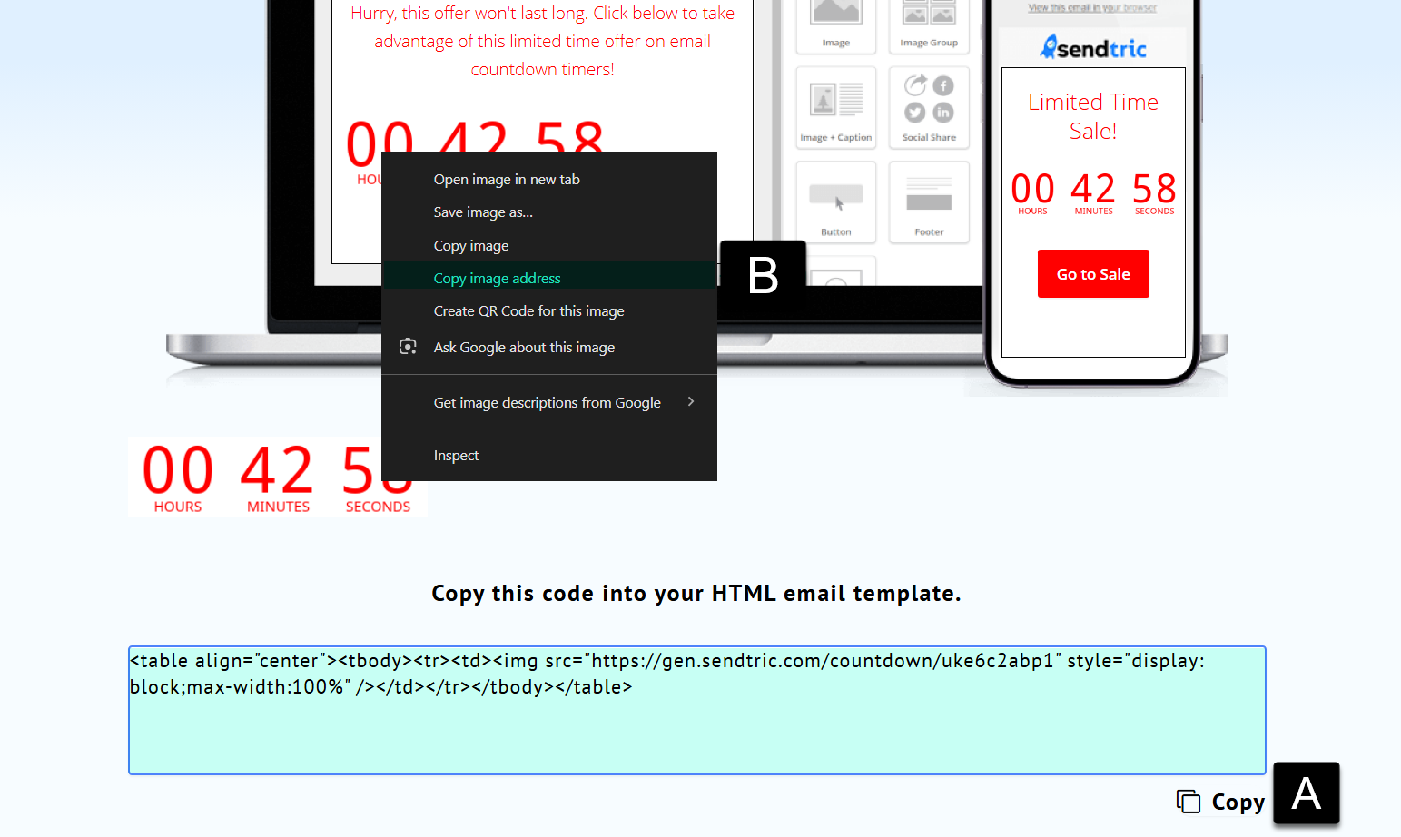 - You’ll receive an HTML snippet with a URL. Copy either the full code (A) for Custom Code or just the image URL (B).
