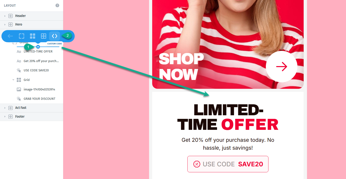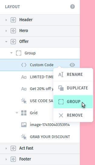 - (Optional) Place the timer inside a Group element. Navigate to the Custom Code element, right-click it, and choose Group to wrap it inside a container. This creates a dedicated container that makes spacing and alignment easier to control without affecting surrounding elements.