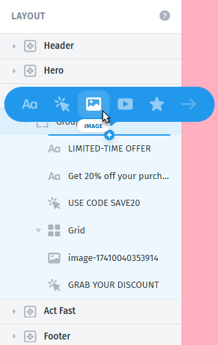 - Click the + button and add an Image element or a content module that includes an image slot.