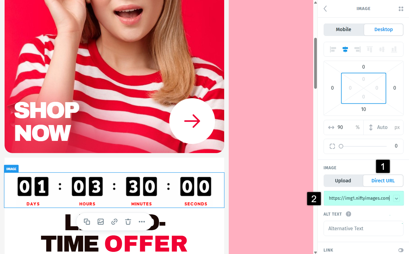 - Select the Image element, and in the right panel, paste the timer Image URL.